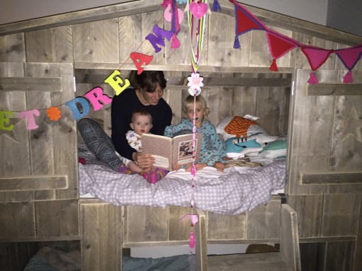 Zo gezellig! In pyjamaatjes Ot & Sien lezen bovenin het Boomhutbed.