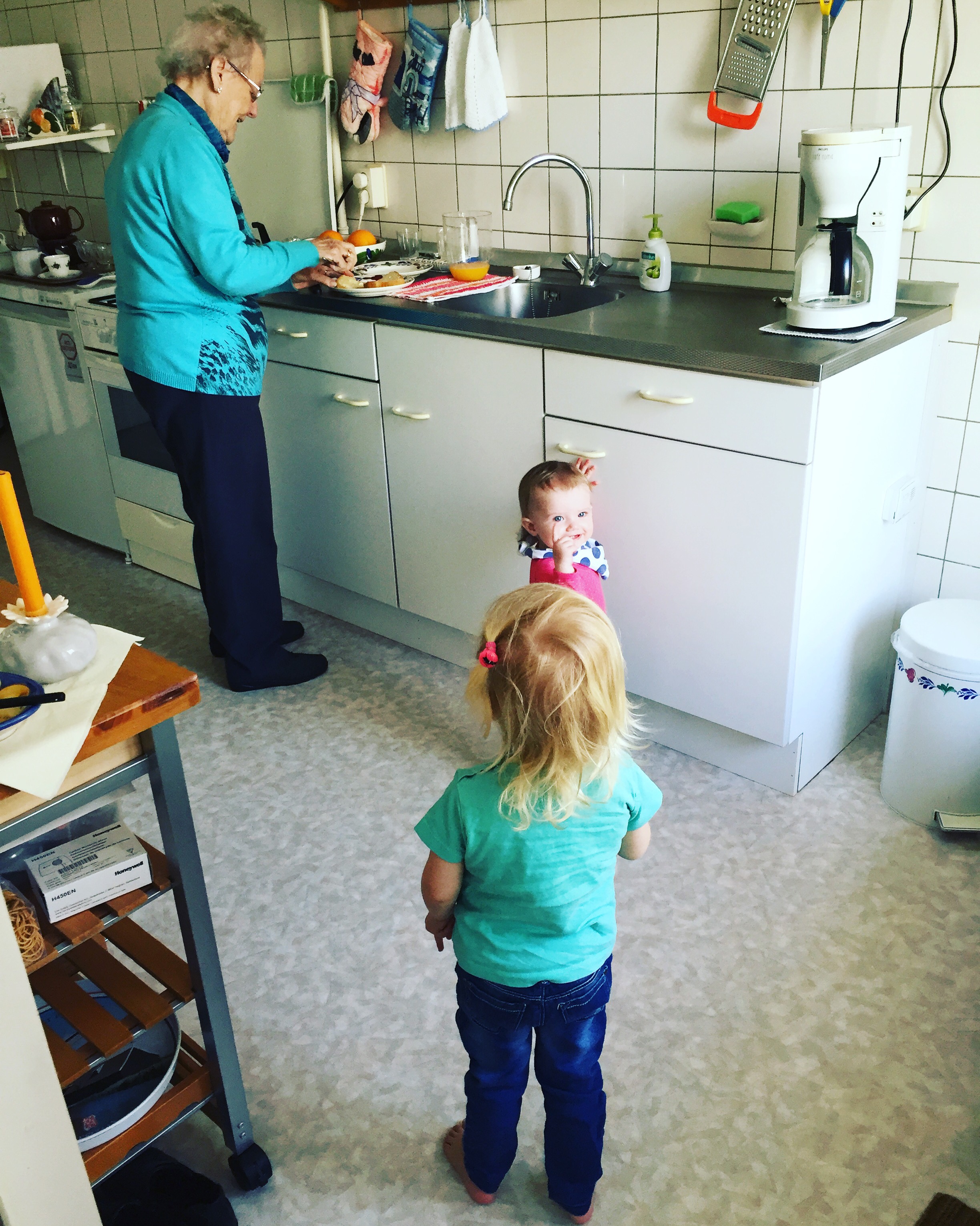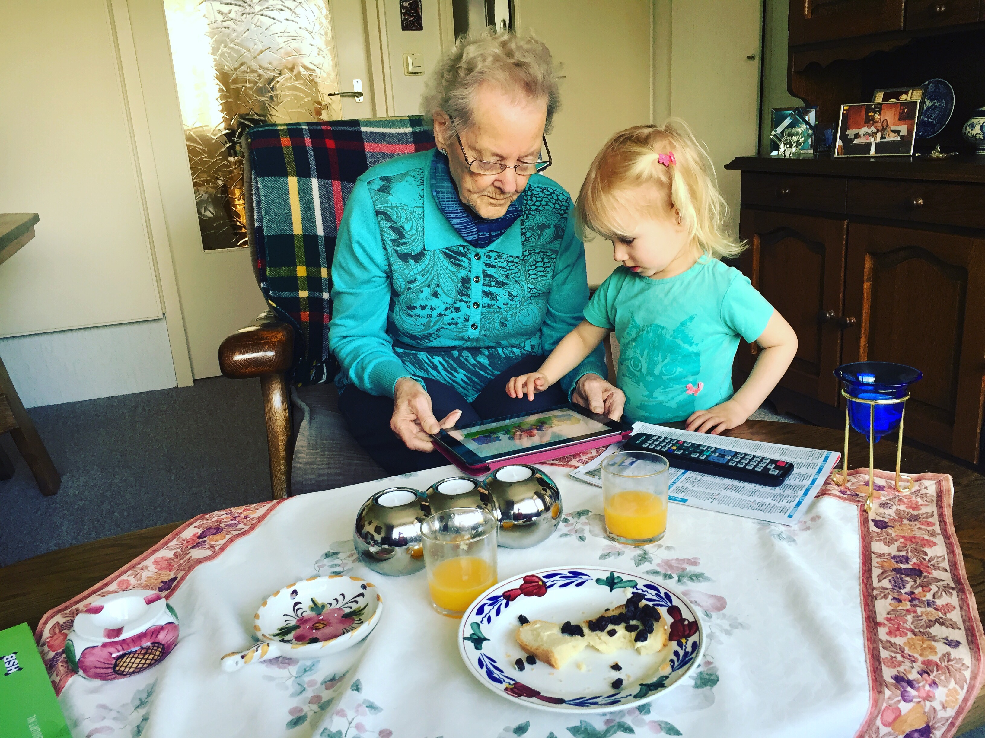 Wat een lol hadden ze met z’n drietjes! Oma Nelly’s beroemde home-made tulband was binnen een minuut weggewerkt, de iPad workshop onder leiding van Jools werd leergierig opgepikt door oma en vice versa kreeg Pippa looptraining van haar bijna een eeuw oudere, maar behoorlijk fitte vriendin die gewoon nog vrolijk door het dorp fietst.