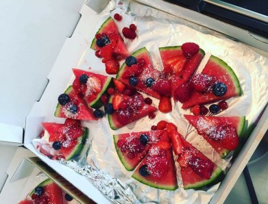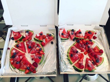 En het is heel simpel te maken. Watermeloen, gemengd rood fruit en wat kokosrasp dat is alles wat je nodig hebt. De echte pizzadozen hebben we bij de pizzaboer uit het dorp vandaan! Succes gegarandeerd! 🍕🍓🍒