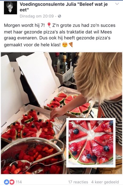 Bij een kinderfeestje hoort natuurlijk een traktatie. Ik heb persoonlijk het allerliefst dat m’n kids (uiteraard) iets gezonds uitdelen op school. En gelukkig zijn ze het (nog steeds) met mij eens. Want gezond kan ook heel erg lekker zijn… Vooral deze gezonde pizza’s van watermeloen. Zowel m’n dochter als m’n zoon hebben enorm veel succes ermee gehad. Bij de kinderen, maar ook zeker bij de juffen 😉