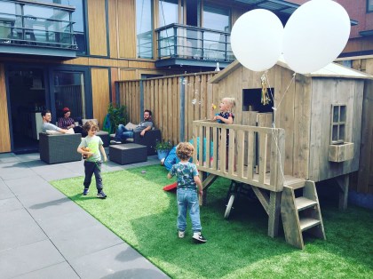 Wat een verrijking van onze tuin, of eigenlijk zelfs ons hele leven in en om het huis. Weer of geen weer, de meiden willen het liefste alleen nog maar met blokken spelen, liedjes zingen, ontbijt eten, filmpjes kijken of boeken lezen in ‘Kasteel oma Nelly’ zoals Jools dit heerlijke huisje heeft gekroond.