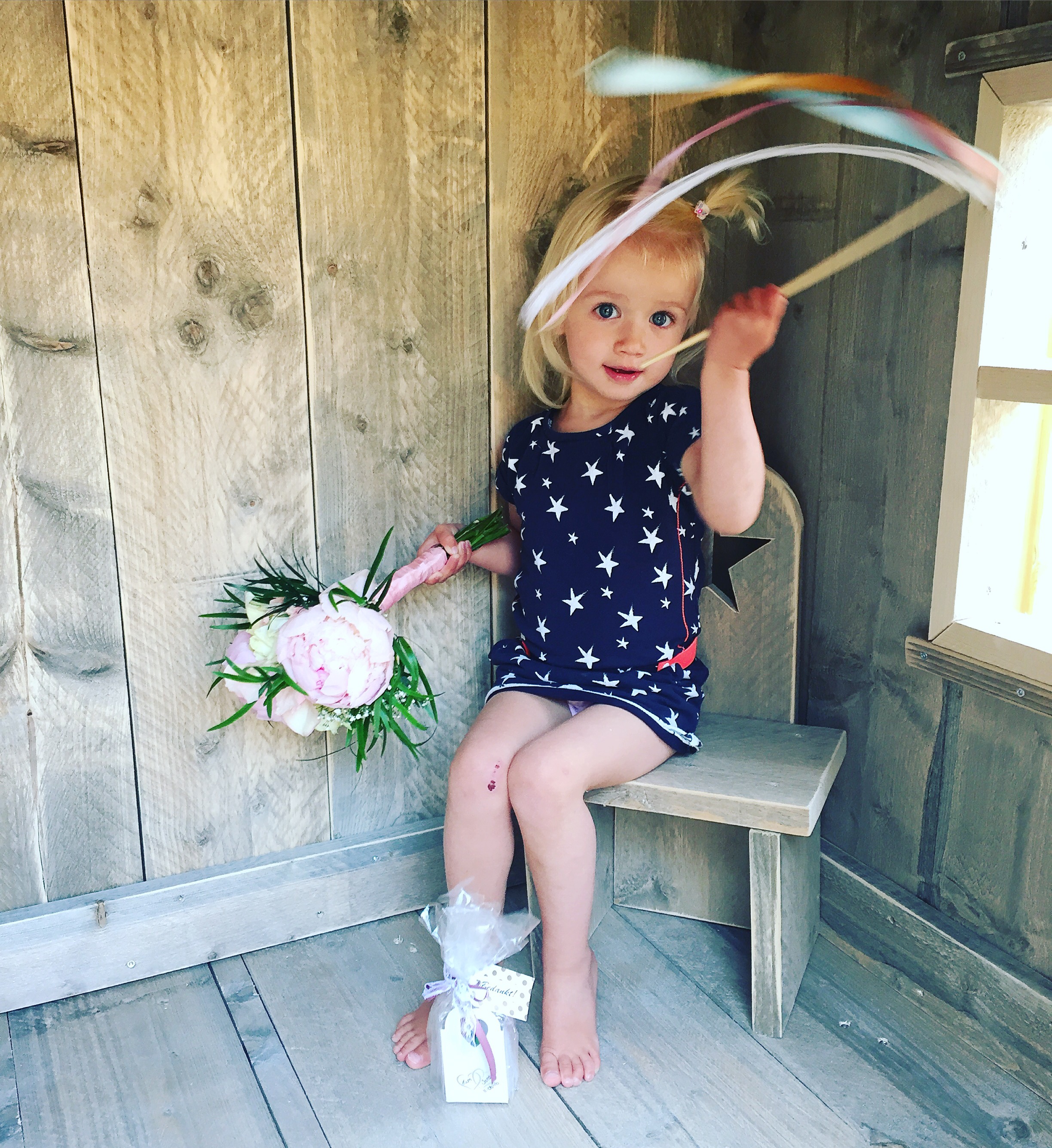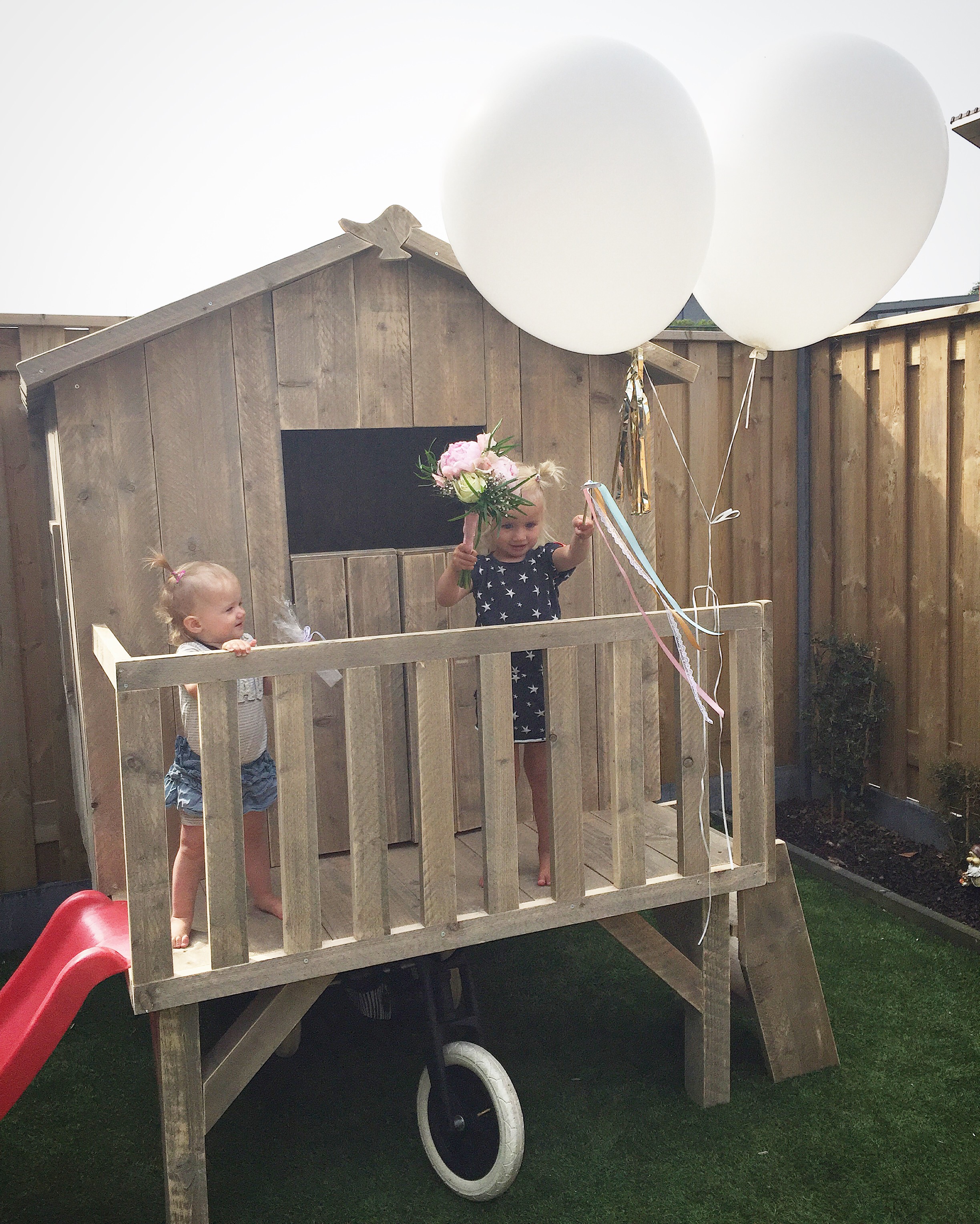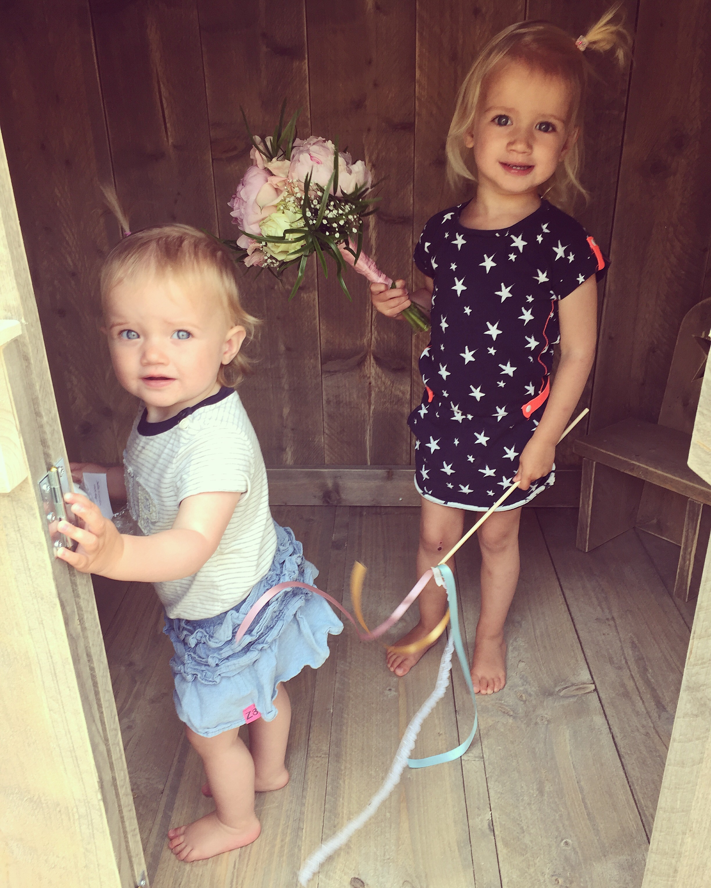 Wat een verrijking van onze tuin, of eigenlijk zelfs ons hele leven in en om het huis. Weer of geen weer, de meiden willen het liefste alleen nog maar met blokken spelen, liedjes zingen, ontbijt eten, filmpjes kijken of boeken lezen in ‘Kasteel oma Nelly’ zoals Jools dit heerlijke huisje heeft gekroond.