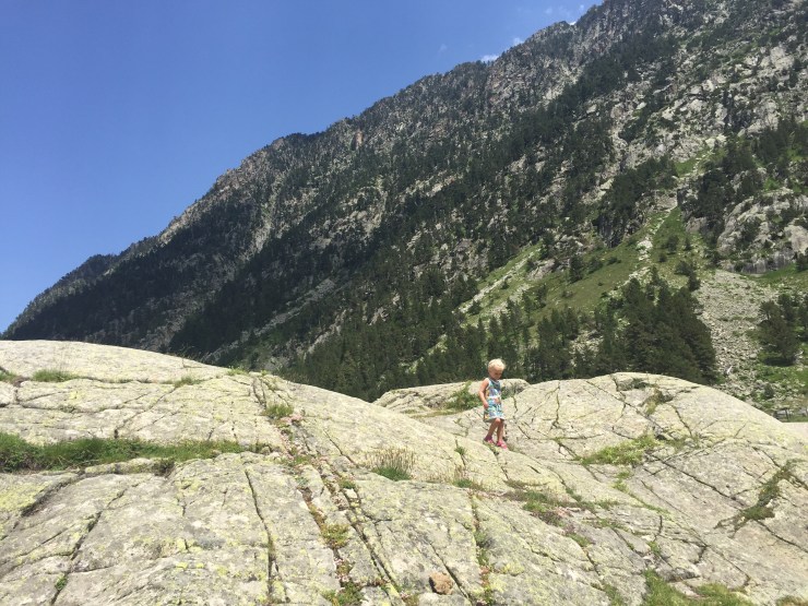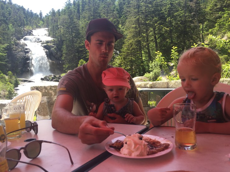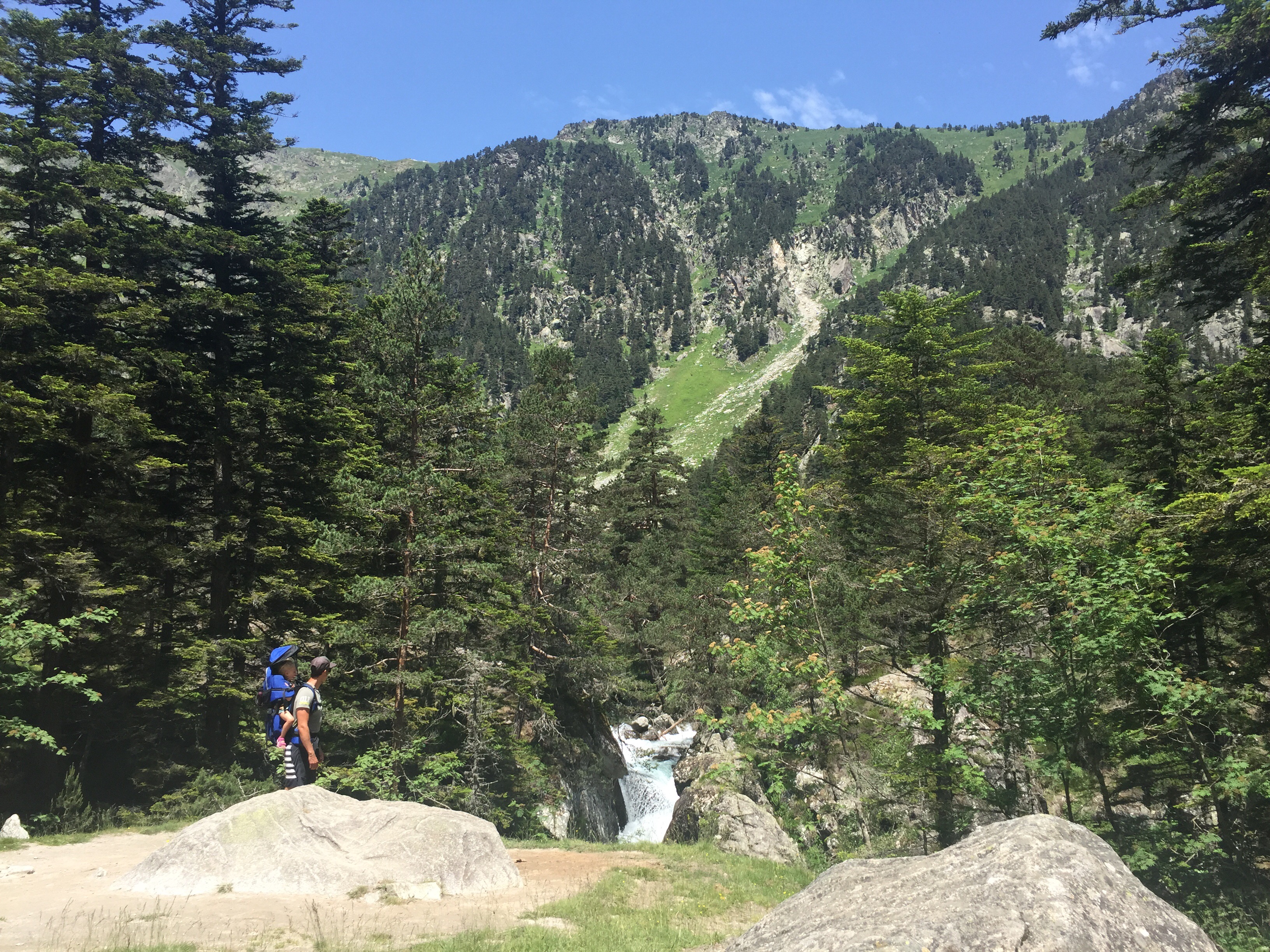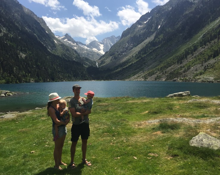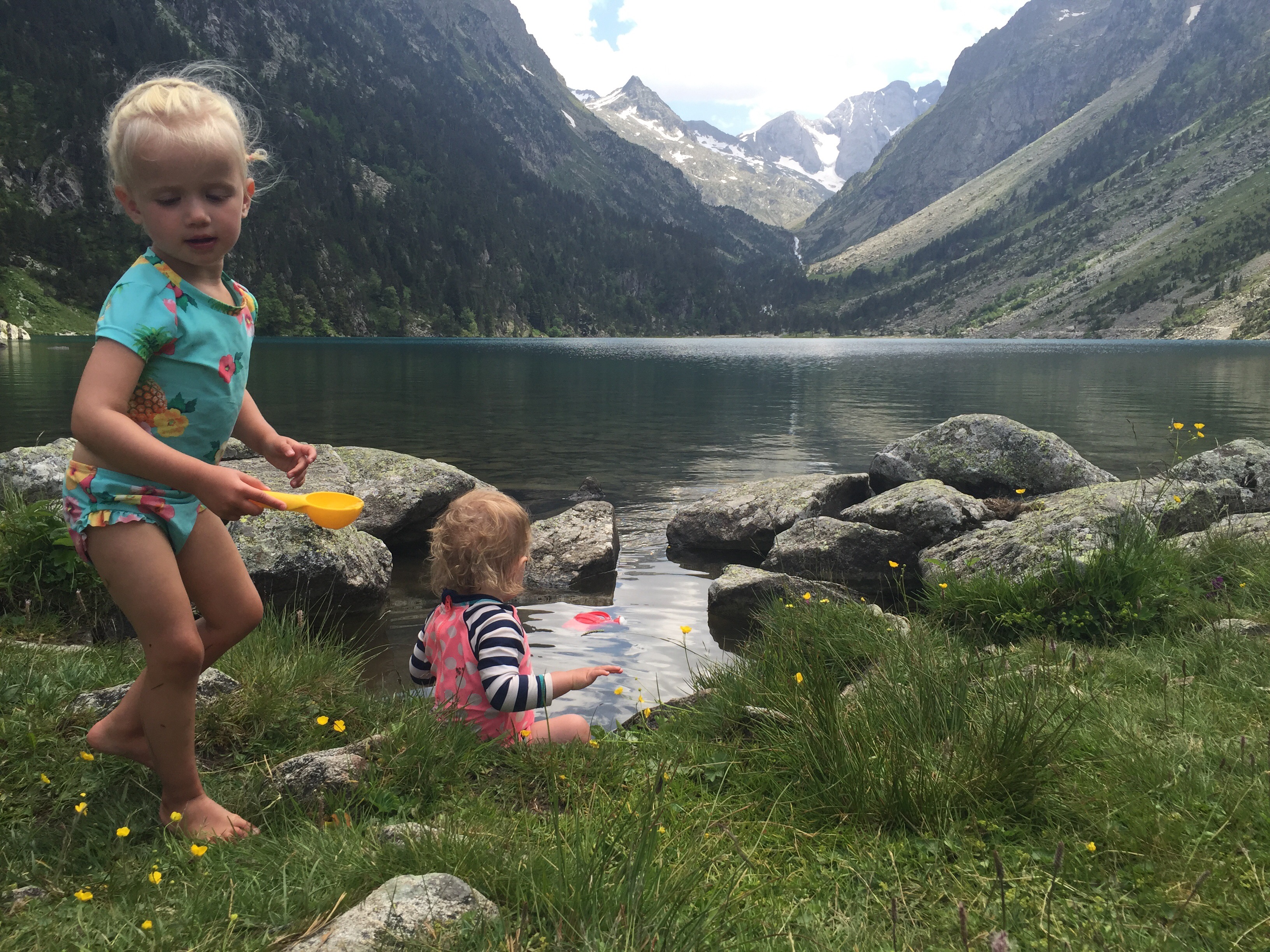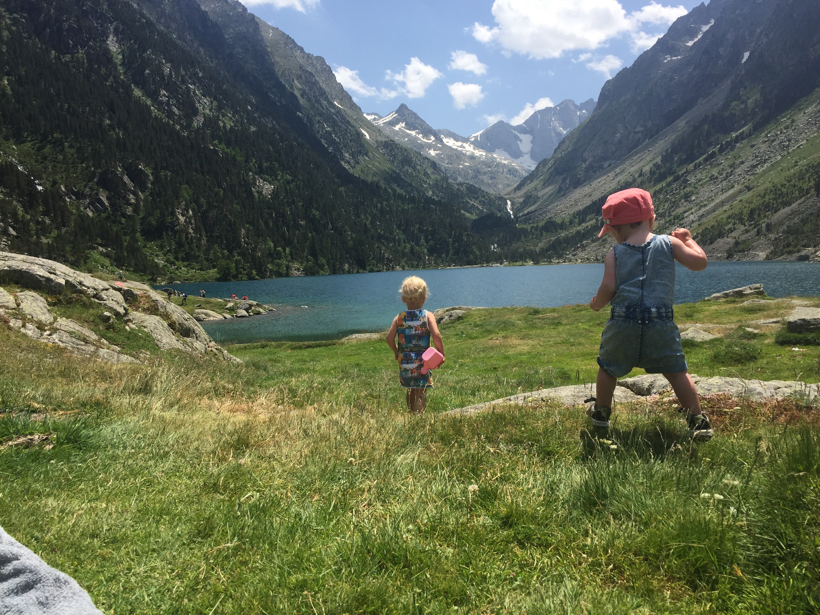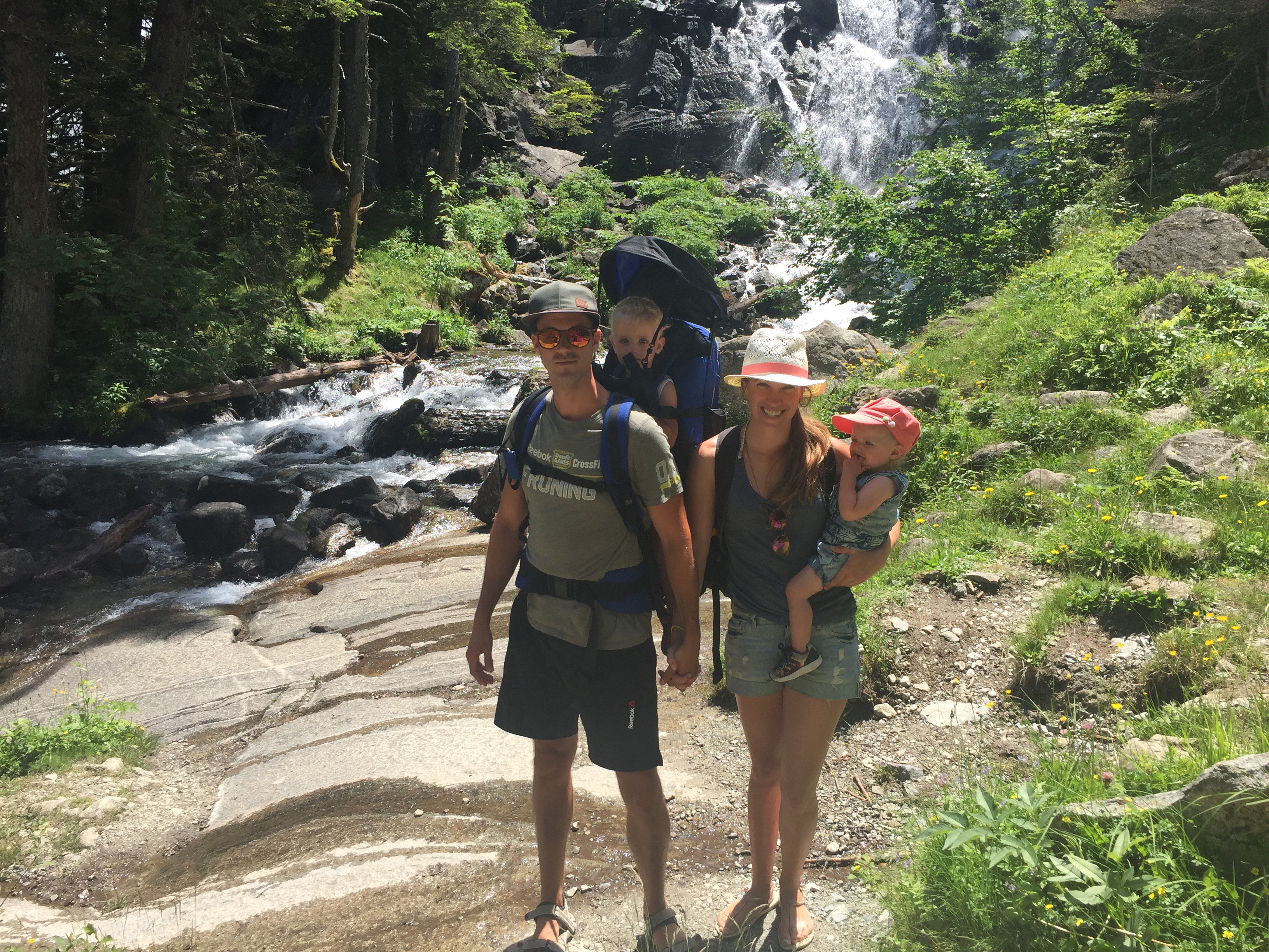 Men neme: 2 kids (Jools -2,5- & Pippa -1-), 2 ouders (Thaddeus & Annette), 1 bestemming (Lac de Gaube -1725m-) en… maar 1 draagzak. Normaal gesproken zou een buggy dan uitkomst bieden, maar daar leende het bergpad naar het meer zich niet echt geschikt voor. Dat betekent dat 1 van de 2 kids zelf zal moeten lopen, want steeds ‘gewoon’ tillen is te heet en de meisjes worden daar te zwaar voor.