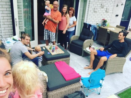 Daarna was de laatste beurt aan ome Mies, tante Cin en neefje Mason. Hoe laat zij aan zouden komen wisten ook mijn ouders niet precies. Ze konden alleen aangeven dat ze ‘zo wel zouden komen’. Nadat ik ook hen spotte bij het voorraam en snel naar de tuin sprintte om iedereen achter het speelhuisje te stationeren, kon de finale van onze enige echte eigen Suprise Show van start gaan. Cindy was al wat in de war gebracht aangezien ze dacht mij door het voorraam gezien te hebben, wat volgens haar natuurlijk helemaal niet kon, dus op het moment dat wij met z’n viertjes als konijntjes uit de hoed sprongen was de verrassing compleet. Mason moest heel even wennen om na een hele maand z’n twee spring-in-‘t-veld nichtjes weer aan z’n haar, oren en wangen te hebben zitten, maar al snel was het weer helemaal als vanouds. Heerlijk om weer allemaal samen te zijn!