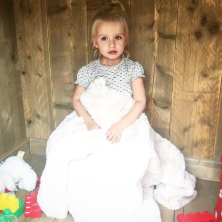 PS: Jools is helemaal verliefd op de Fake Fur Jacket… Ze zegt dat hij net zo zacht is als Rob de Beer, haar favoriete knuffel. Totdat het weer straks kouder wordt fungeert mijn nieuwe jas als Jools haar blankie in het speelhuisje in de tuin. Cute!!!