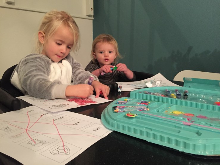 Tussen deze snack-time en het diner door werkten een puzzel en wat tekenplezier als redelijk oké tijdverdrijf, maar het ijs bleef dun. Ieder ieniemieniedingetje dat één van de meiden niet zinde was reden genoeg om de waterlanders rijkelijk te laten vloeien.