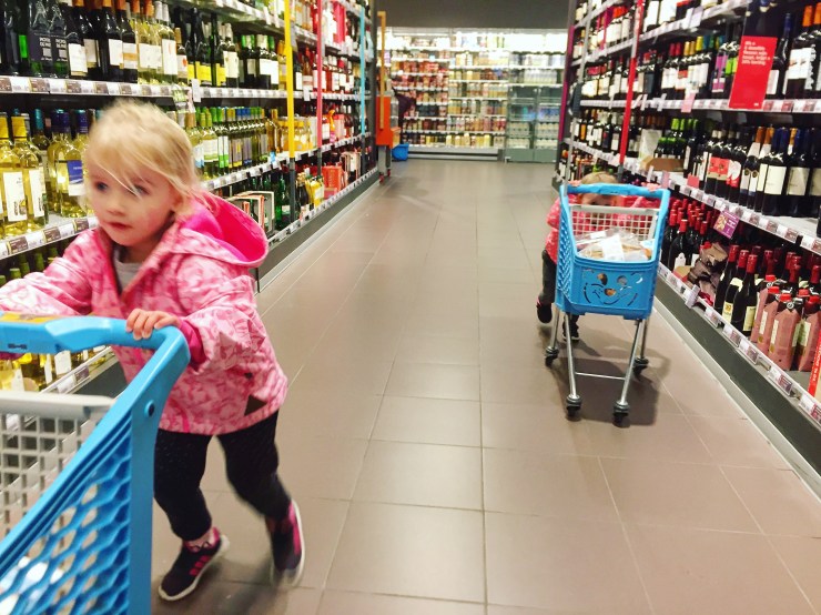 Met twee kiddies van 1 en 3 jaar + ieder een eigen volgeladen winkelwagentje DÍT gangpad kiezen…. De kans dat het mis zou gaan was natuurlijk ENORM.