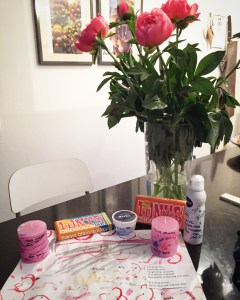 Daarna werd ik mégaverwend met zelfgemaakte en versierde kaarsen, Nivea douchegel + crème, 2(!) Tony’s Chocolonely repen, een tekening met gedicht én roze pioenrozen. TE lief!!!!