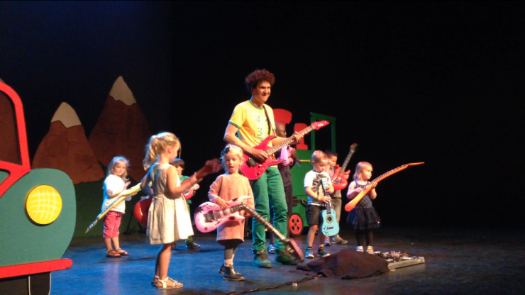 Toen mister Dirk Scheele himself gisteren in Schouwburg Het Park in Hoorn vroeg wie er samen met hem een Rock Band wilden vormen, staken Jools en haar vriendin Belle gelijk hun vingers op. (wat ik van Belle wel verwacht had, als echt podiumbeest, maar Jools vindt dit soort dingen doodeng…!) Ennnnn van álle kindjes die er waren, werden onze meiden uitgekozen door Dirk om op te komen treden op het podium. Oh, wat vond Jools dat spannend zeg! Ze raapte al haar moed bijeen en stond niet veel later naast Dirk hét Gitaarlied te zingen (ja, die met 6 snaren). Na deze one minute of fame besloot ze dat het toch eigenlijk wel heel erg veel te spannend was… Bij mama op schoot (b)leek een stuk aantrekkelijker. Maar mán. Wat was ik supertrots op m’n guppie dat ze het tóch geprobeerd heeft en zich eventjes over haar angst heen zette.