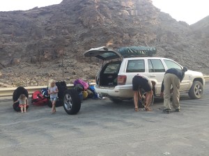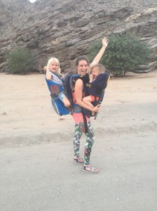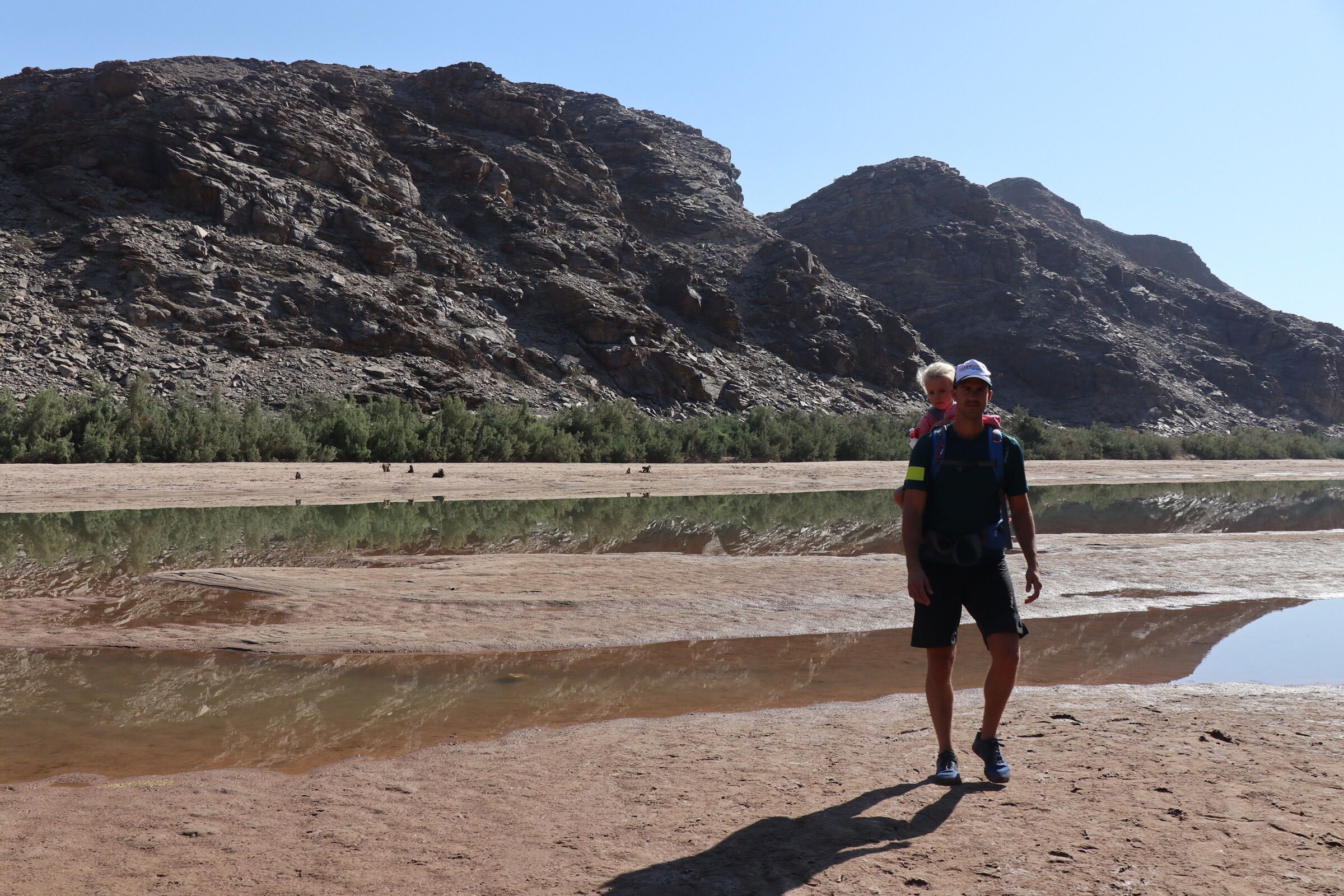 Terwijl we de achterbak van de Jeep leeghaalden (want het extra wiel lag onderop), stopte er een auto met medewerkers van Ai Ais om ons te helpen. Maar het zou nog wel even gaan duren (de krik werkte niet enzo), dus besloot ik met de meiden te gaan lopen naar de camping. Een rugdrager voor en eentje achterop: let’s GO!