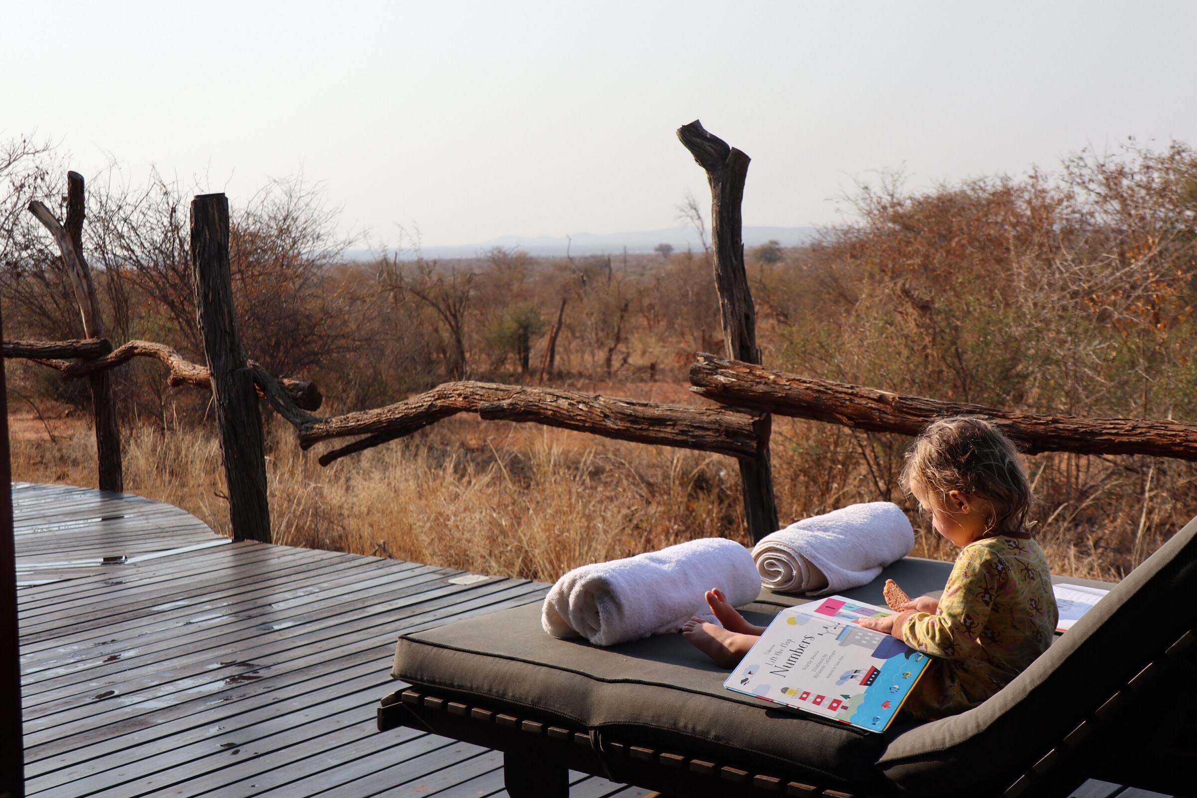 Denk aan een lieve mevrouw die wanneer het bijna donker werd de gordijnen dicht kwam doen, matjes + slippers naast je bed klaarlegde, alle lichtjes aandeed en fles water + glas op je nachtkastje neerzette. Denk aan een lieve meneer die het vuur in de open haard aanstookte voor een lekker warme nacht. Denk aan gepersonaliseerde waterflessen (eco-friendly!). Denk aan een Eco House waar activiteiten voor jong en oud worden georganiseerd op het gebied van natuureducatie. Denk aan een rugtas met krijtjes en Madikwe Cubz werkboek voor de meiden. Denk aan een verwarmd zwembad met uitzicht op een waterpoel waar dagelijks allerlei wilde dieren komen drinken. Denk aan een speciale Bumble Drive voor kinderen van 2-6 jaar die nog niet mee mogen op de reguliere Safari Drives, maar hierdoor toch veilig dieren van dichtbij kunnen bewonderen. Denk aan de hele dag door fantastische maaltijden (lekker veel groenten en fruit!). Denk aan een gin-proeverij bij zonsondergang tijdens je safari. Denk aan een zwembadje op je eigen terras……