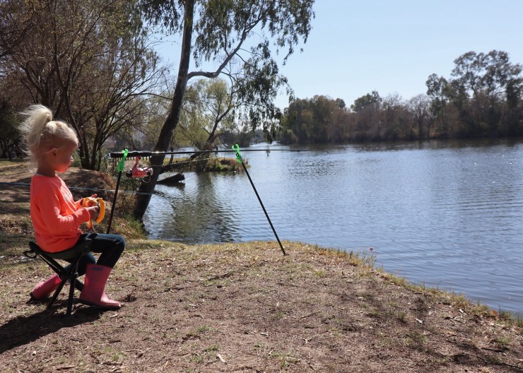 De volgende ochtend werden onze meiden door de vriendinnen en hun vader gevraagd om mee te gaan ‘visvang’ (heerlijk die Afrikaanse woorden!). Leuk! Jools luisterde aandachtig naar de instructies en heeft wel een heel uur aandachtig naar haar dobber gestaard. Niets gevangen, maar wel heel goed haar best gedaan! Tijdens het vissen werd door de Zuid Afrikanen een enorme zak gekleurde rondjes opengetrokken. Bleek popcorn met een extra vrolijk laagje te zijn. Om 9 uur ’s ochtends. We wilden geen party poopers zijn, dus knepen we 4 oogjes dicht terwijl Pippa de halve zak wegwerkte en haar gezicht, handen en shirt 50 Shades of The Rainbow kleurden. Ter compensatie van alle e-nummers boden wij het gezelschap bananen en mandarijen aan. Jools smulde hiervan, maar bleef geconcentreerd naar haar dobber kijken.