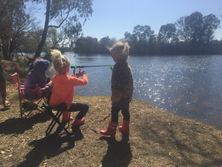 De volgende ochtend werden onze meiden door de vriendinnen en hun vader gevraagd om mee te gaan ‘visvang’ (heerlijk die Afrikaanse woorden!). Leuk! Jools luisterde aandachtig naar de instructies en heeft wel een heel uur aandachtig naar haar dobber gestaard. Niets gevangen, maar wel heel goed haar best gedaan! Tijdens het vissen werd door de Zuid Afrikanen een enorme zak gekleurde rondjes opengetrokken. Bleek popcorn met een extra vrolijk laagje te zijn. Om 9 uur ’s ochtends. We wilden geen party poopers zijn, dus knepen we 4 oogjes dicht terwijl Pippa de halve zak wegwerkte en haar gezicht, handen en shirt 50 Shades of The Rainbow kleurden. Ter compensatie van alle e-nummers boden wij het gezelschap bananen en mandarijen aan. Jools smulde hiervan, maar bleef geconcentreerd naar haar dobber kijken.