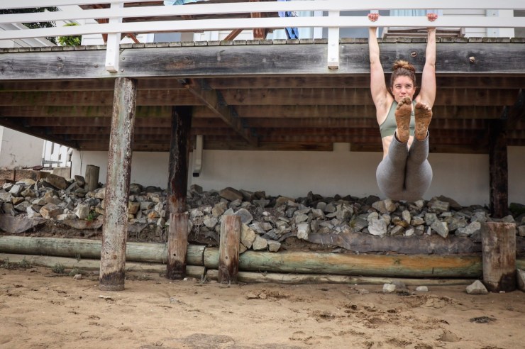 “Hé! Aan die balken kun je prima hangen. Top om wat L-Sit pull-ups te oefenen. Het móét me toch lukken om dat eerder te kunnen dan T.”