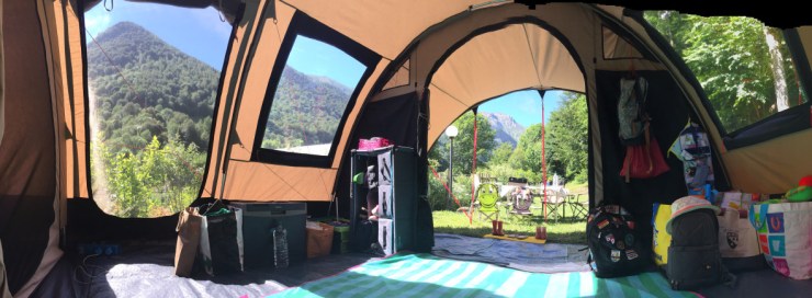 - Een tent waar je rechtop in kunt staan. Als het goed is breng je niet al te veel tijd in de tent door en kun je zoveel mogelijk lekker buiten zijn, maar bij (iets) minder droog weer is het toch wel heel erg fijn wanneer je binnen een beetje kunt ‘leven’. Wanneer je dan de hele tijd moet bukken kan dat op den duur vervelend gaan worden. In onze tent konden we zelfs een eettafel binnen of onder de luifel zetten zodat je zo nodig droog kunt eten.