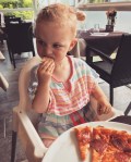 We hadden de sfeer er goed in! Lauren vertelde ongeveer de hele rit dat ze pink ijsjes wilde eten en heel veel pizza. En Pippa vond het allemaal wel prima. We reden naar Zuid Duitsland waar we midden in de regen belandden… Iets waar ze in Nederland op dat moment om smeekten. We waren allemaal best moe en ik kan je vertellen; om dan met z’n vieren in een caravan te zitten en naar buiten te staren naar de regen…nee, dat was niet helemaal wat we ons voorgesteld hadden. Maar, we hielden de moed erin, we waren tenslotte nog niet op onze eindbestemming. We besloten naar het restaurant te gaan (‘laten we op tijd gaan, dan heeft niemand last van ons’ aldus manlief) waar Pippa de tent af brak. Mijn heerlijke ijskoude wijn vloog over de tafel, patat werd naar de buren gesmeten en toen we dachten dat het niet erger kon, ontdekten we dat Lauren het prachtige geborduurde tafelkleed had onder getekend met haar nieuwe stiften. Het was overduidelijk tijd om naar bed te gaan.