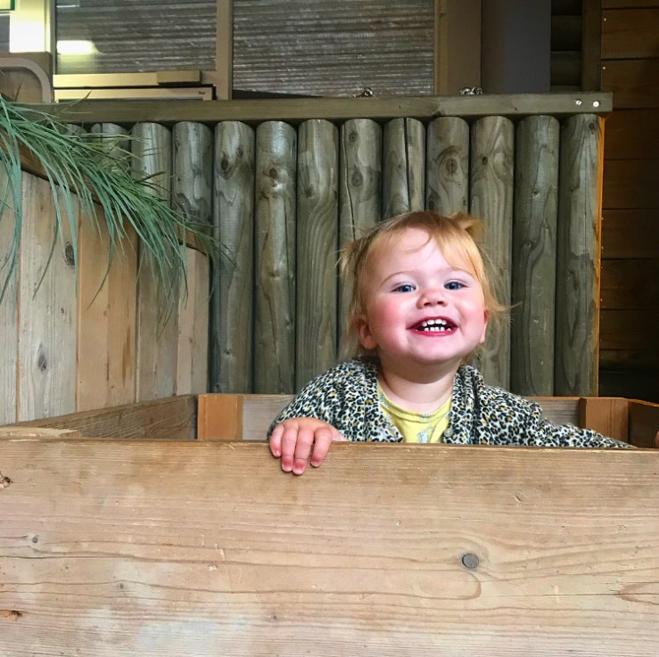 Vrijdag was het zover. We hadden de auto volgeladen en aan het einde van de middag – want ja, er moet ook gewerkt worden- reden we naar het zuiden: op naar het Dierenbos! We werden al blij toen we het park opreden. Een lange laan met hele mooie hoge bomen met allemaal gekleurde vogelhuisjes eraan. Super sfeervol! Bij de balie werden we vrolijk welkom geheten en kregen we een welkomspakket met een fles prosecco en voor de meisjes een knuffel. Terwijl we aan het inchecken waren slaakte Lauren een gil van blijdschap: “Ballen gooien mama! KIJK!”. Vervolgens zette ze het op een rennen naar de bowlingbaan. Dat is natuurlijk ook echt fantastisch! We besloten eerst naar ons huisje te gaan. Eenmaal daar aangekomen werden we nog blijer.