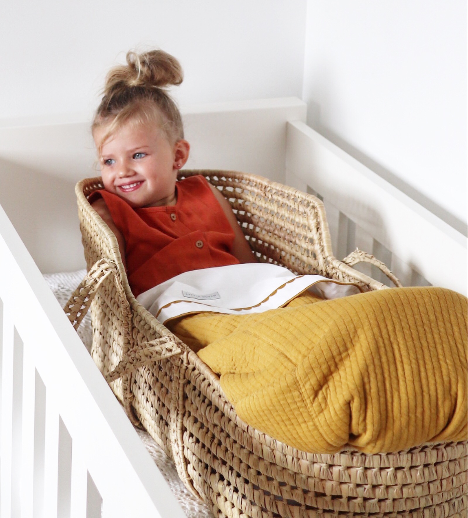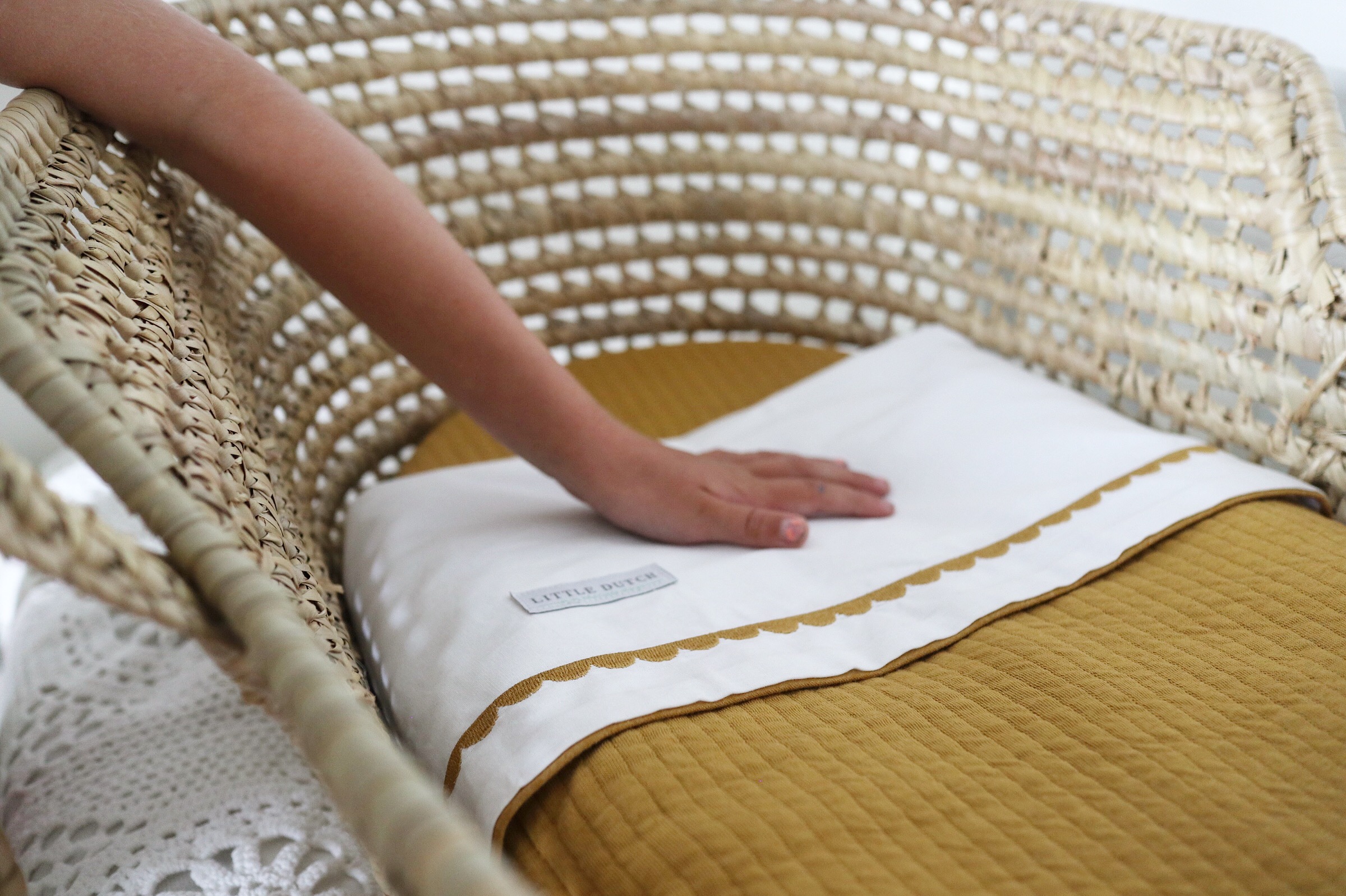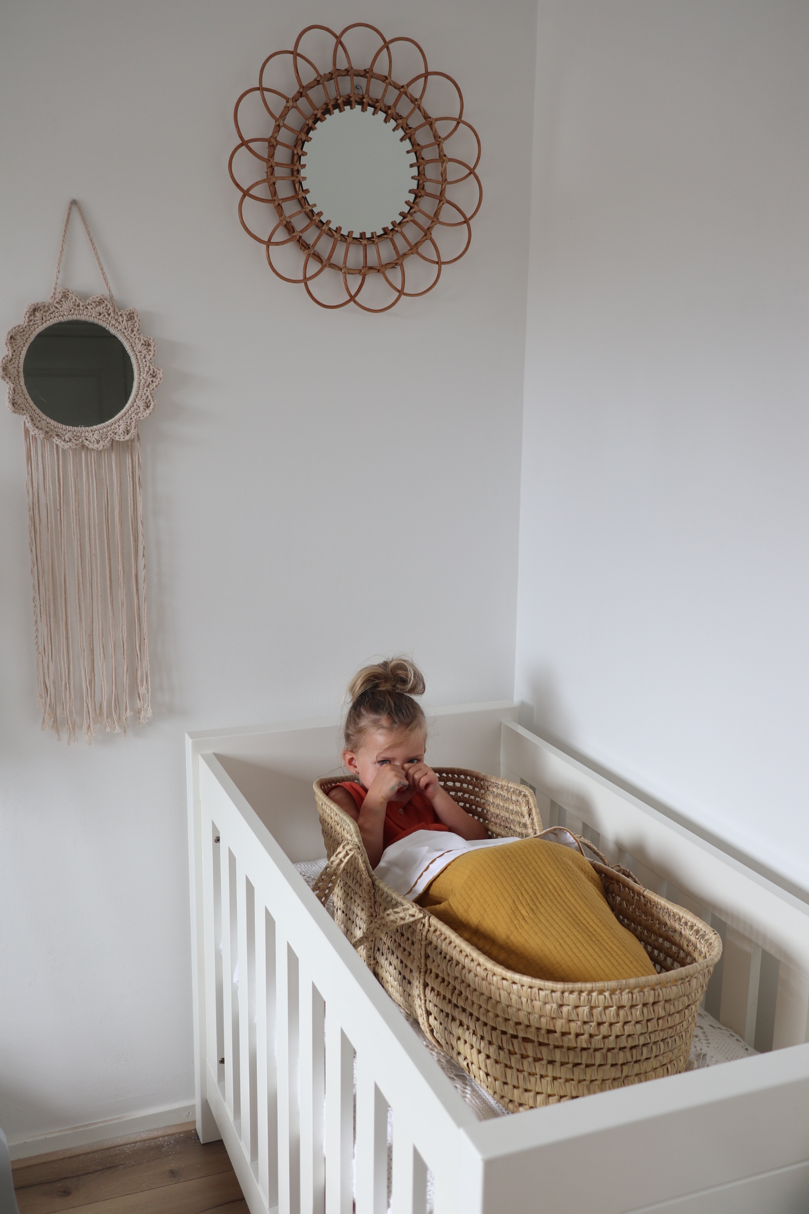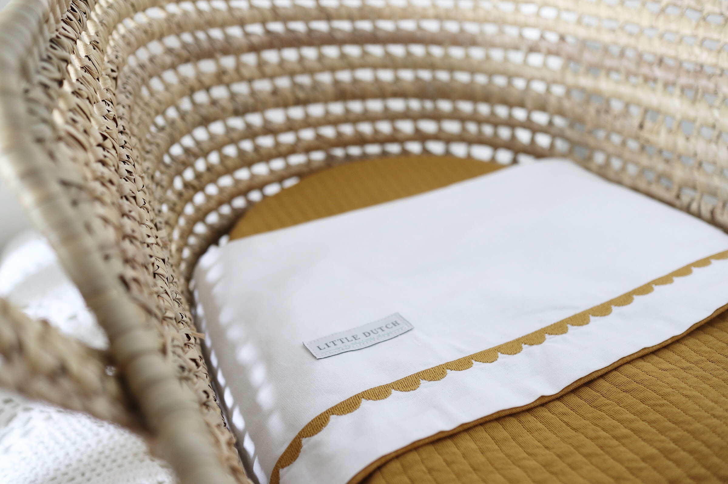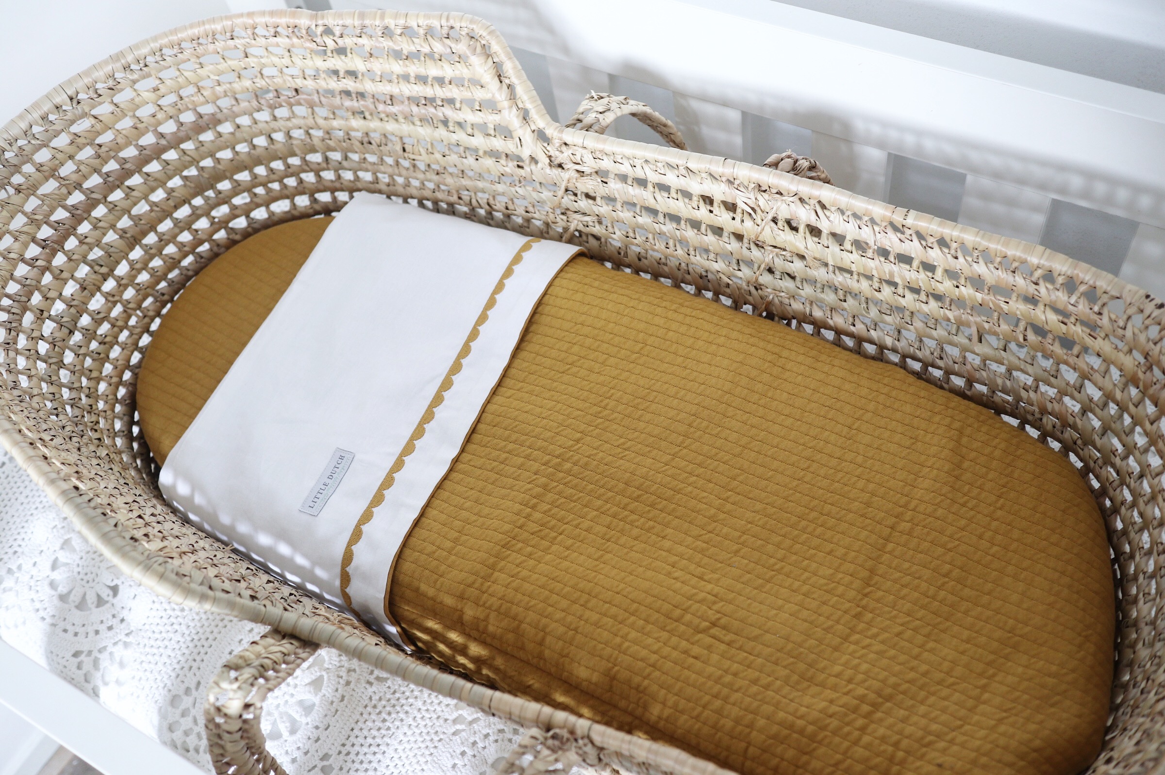 Hoe vind je de bekleding van het mandje? Het wieghoeslaken, het wieglakentje en wiegdekentje zijn van Little Dutch en komen uit de serie ‘Pure Ochre’. Het past zo prachtig in de babykamer! We worden er iedere keer blij van wanneer we er naar kijken. Moet je je voorstellen hoe blij we worden wanneer we er naar zullen kijken wanneer er een baby’tje in ligt over 2 weken!?! (of eerder… dat weet niemand ;-))