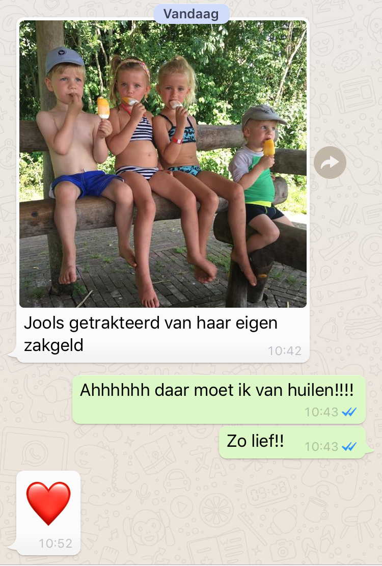 Later op de ochtend stuurde Anouk mij een foto van Jools, Pippa en neefjes Joep en Moos -met allemaal een ijsje- met het onderschrift: “Jools getrakteerd van haar eigen zakgeld.” Nou…. dat is toch niet te doen!!! M’n moederhart smólt en in m’n ogen ontstond een rivier van liefde. OCH onze Jools! Wat niet normaal lief!