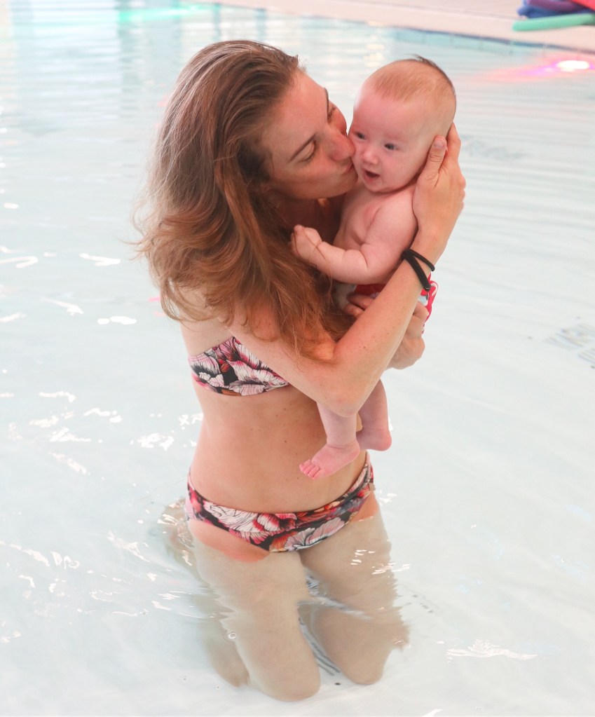 Na een hele nacht knuffelen (Sol was behoorlijk onrustig tussen 23.00 uur en 7.00 uur), een ochtendje gezellig ontbijten (ja écht! vanochtend was gezellig!) en een leuke eerste Babboe Bakfietsrit naar de school van Jool & Pippa, ‘doken’ Sol en ik samen het zwembad in.