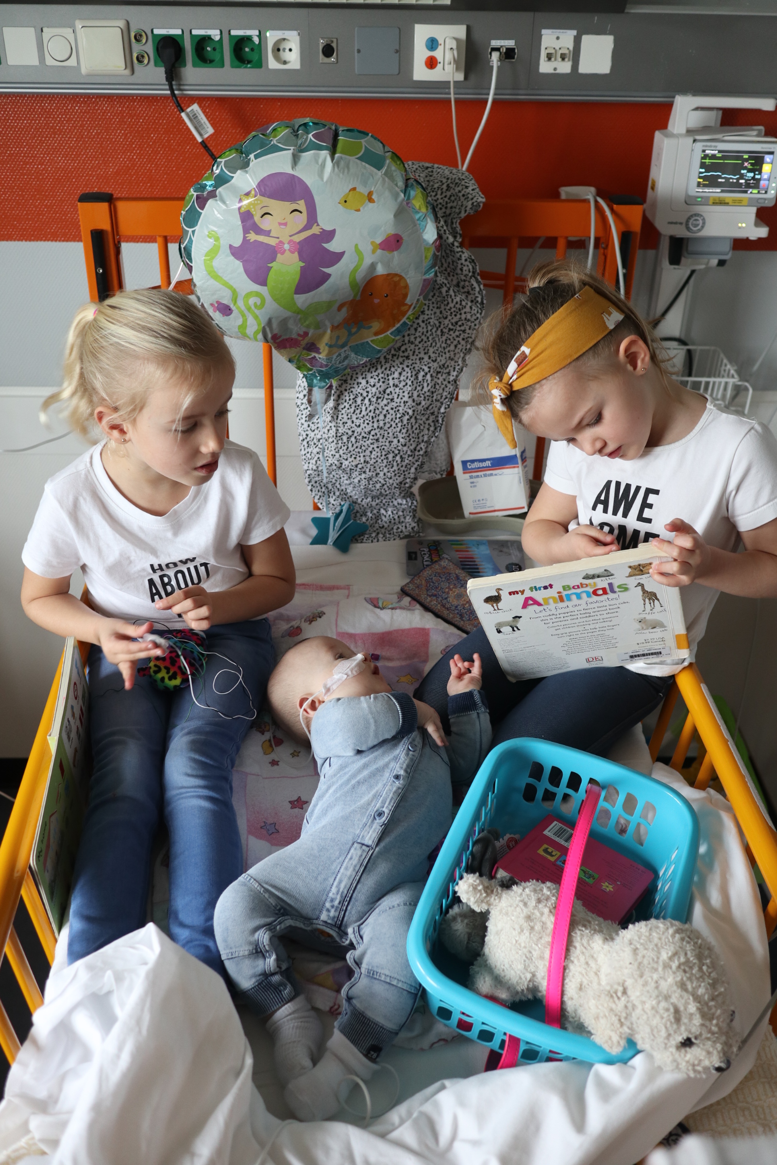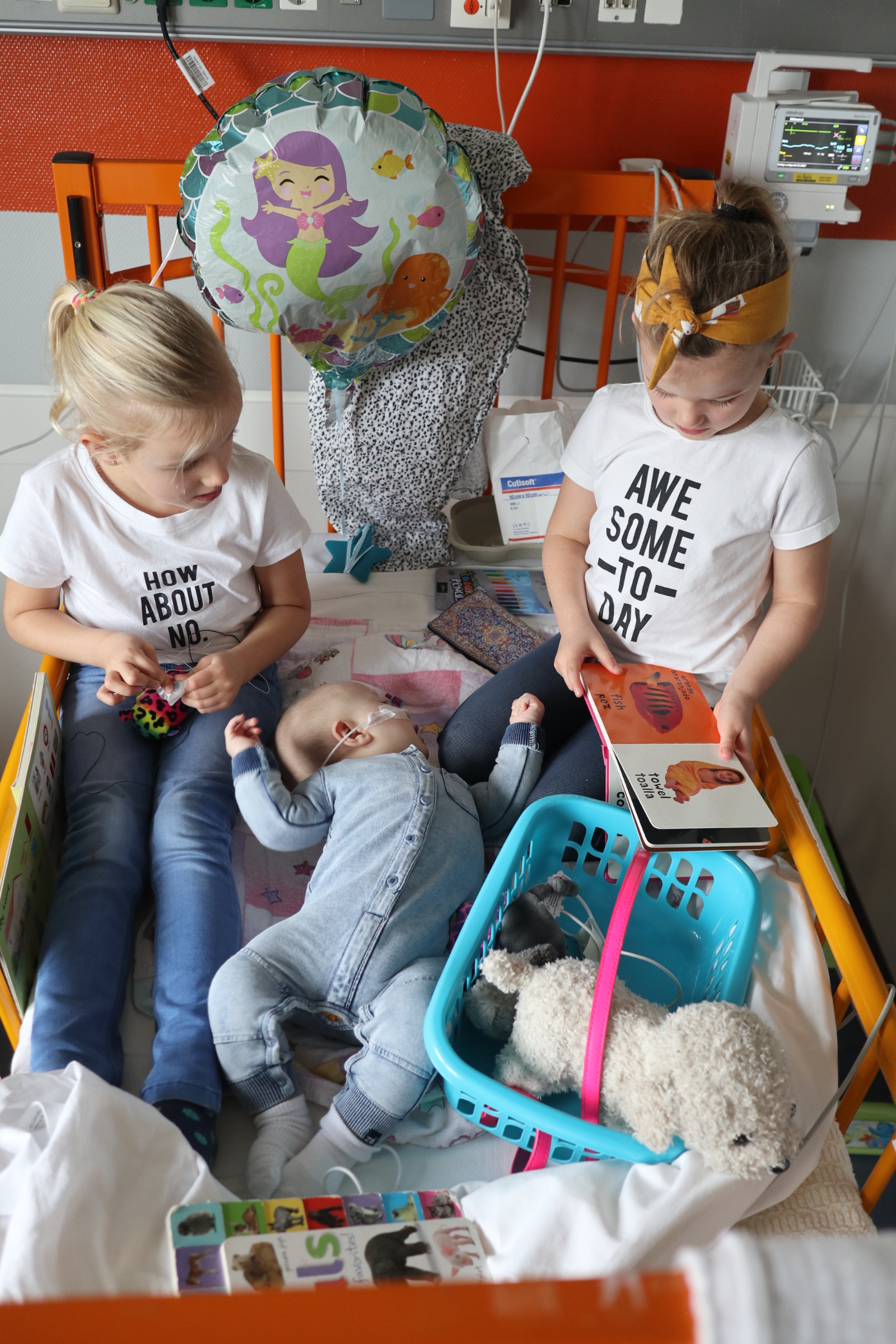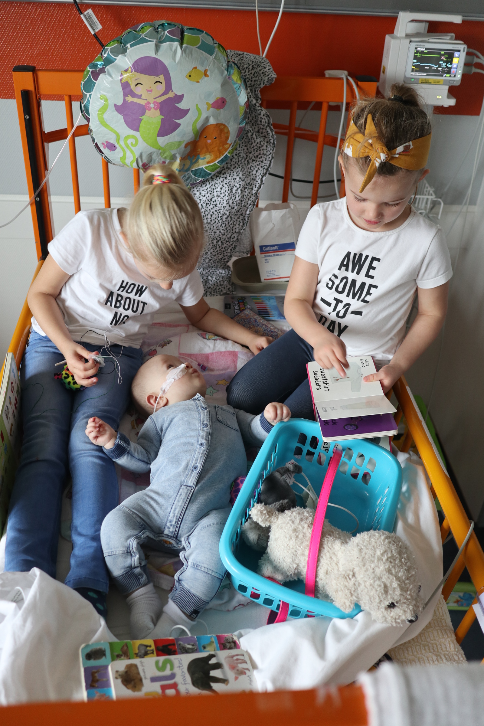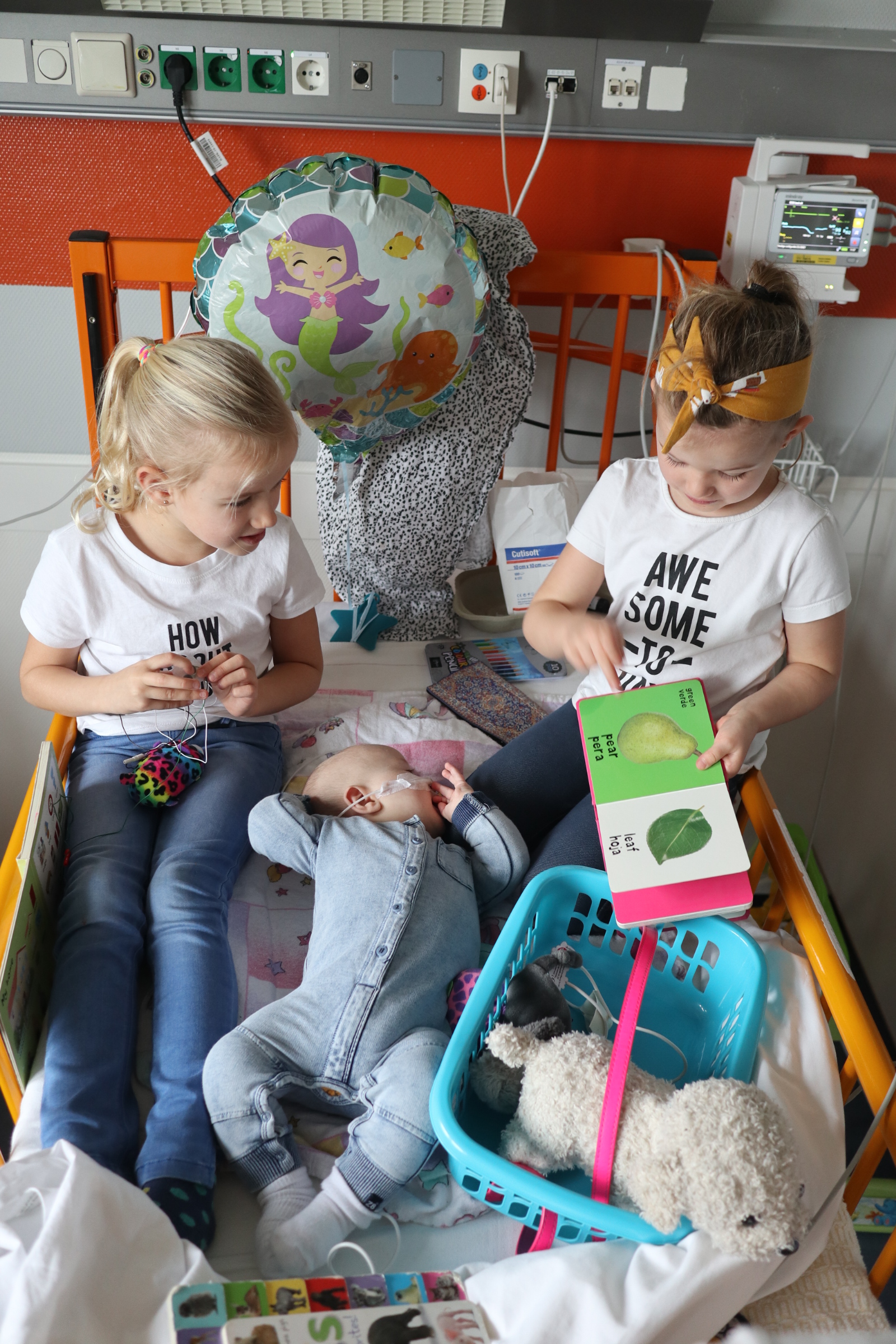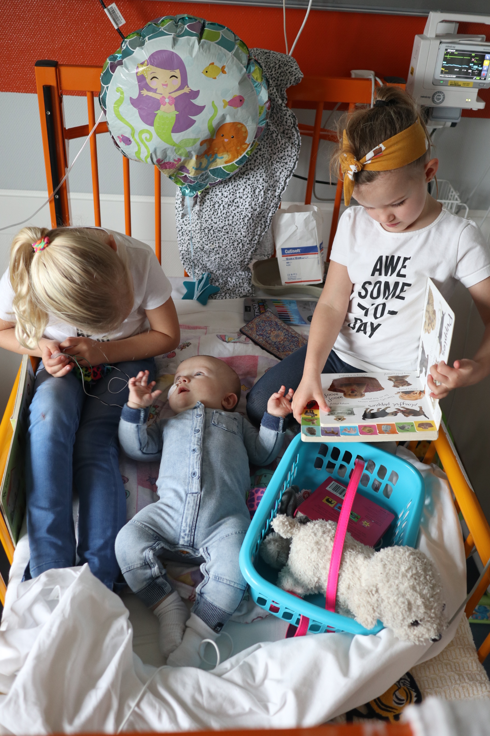 En toen werd ons wereldje letterlijk en figuurlijk heel klein. We leefden op een vierkante meter met ons zieke mannetje. We konden geen kant met hem op ivm alle snoeren en na 2 dagen waren daar ook een sonde en een zuurstofslangetje aan toegevoegd. Alles om hem te helpen om aan te sterken en het virus te bestrijden. Wat ook goed hielp waren de bezoekjes van Sol zijn allerliefste zussen. Zodra zij Sol z’n kamertje binnenkwamen, zag je bij Sol wat meer leven in zijn ogen. Hij is ZO verliefd op zijn zussen, dat hij voor hen altijd nog ergens een restje energie heeft om naar hen te lachen. Jools en Pippa kwamen zo goed als dagelijks twee uurtjes op bezoek en vermaakten zich prima met rubber handschoenen, mondkapjes, een white board en een activiteitenboekje die ze van de pedagogisch medisch medewerkster hadden gekregen. De meiden kunnen zo aan de slag als Clini Clowns, want hun voorleesverhaaltjes, hondenshows en liedjes vielen helemaal in de smaak bij de patiënt. Zelfs op z’n allerziekste momenten reageerde hij toch op zijn zussen. Als papa en mama kun je daar alleen maar niet normaal trots op zijn.