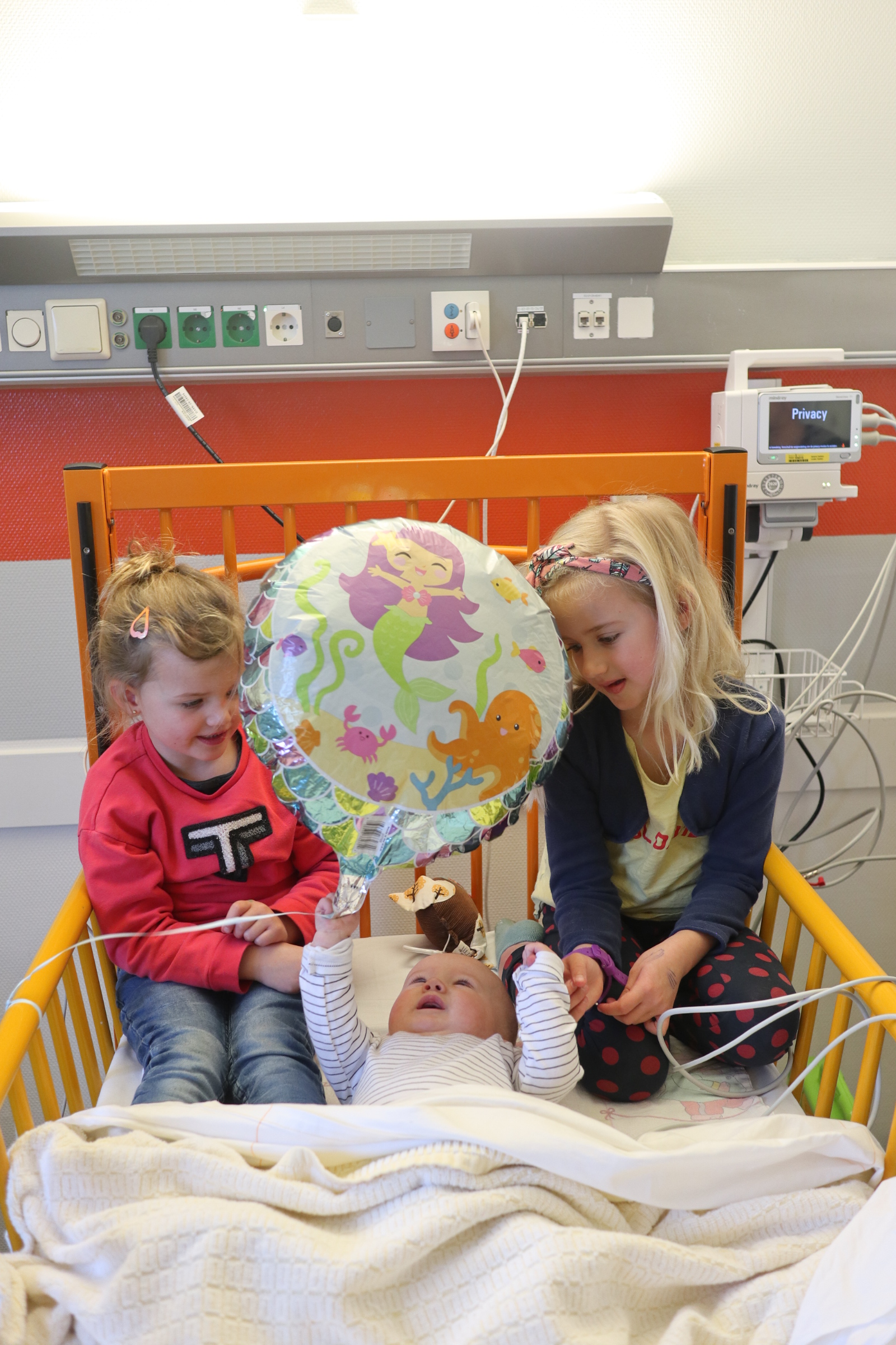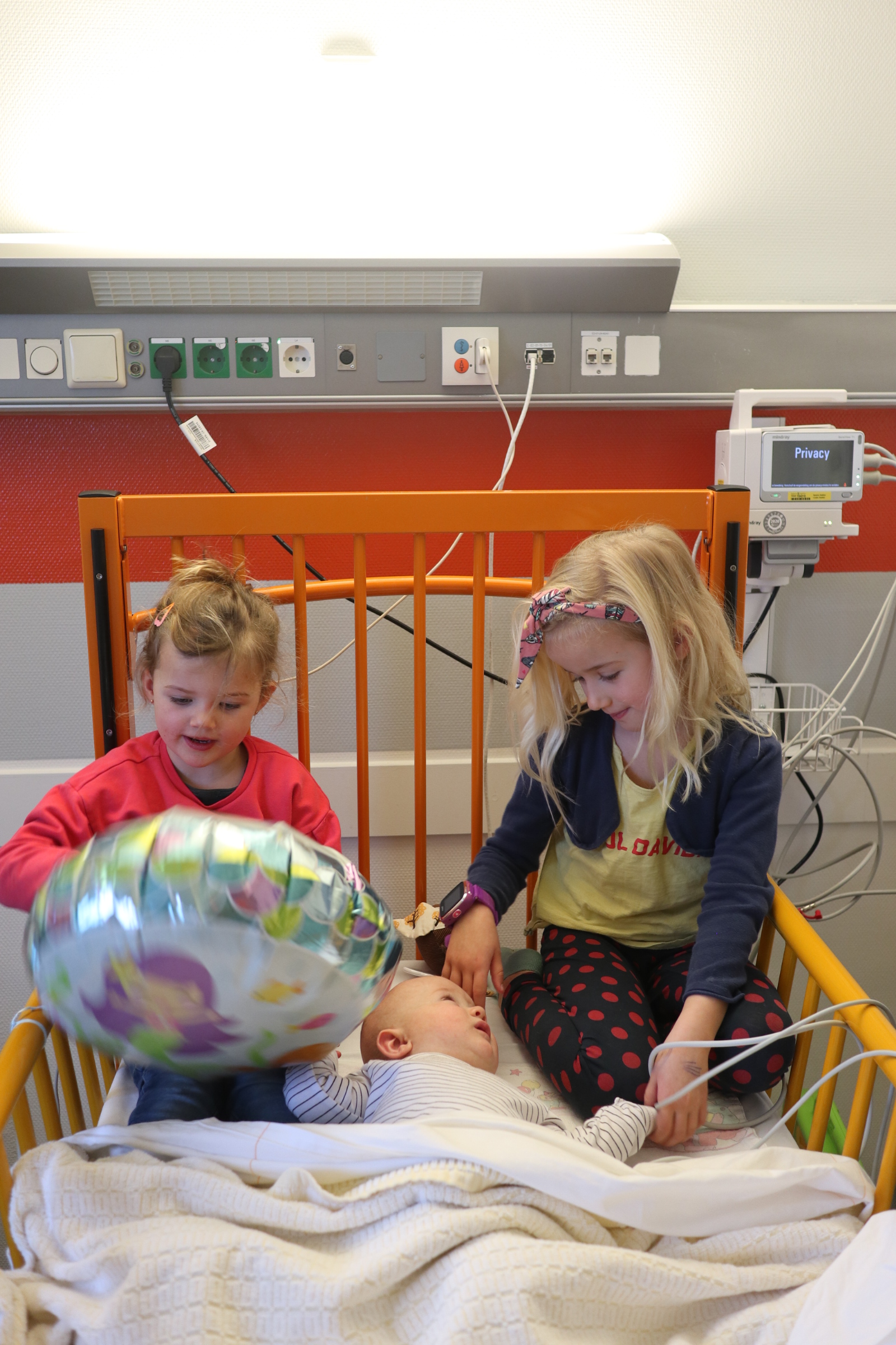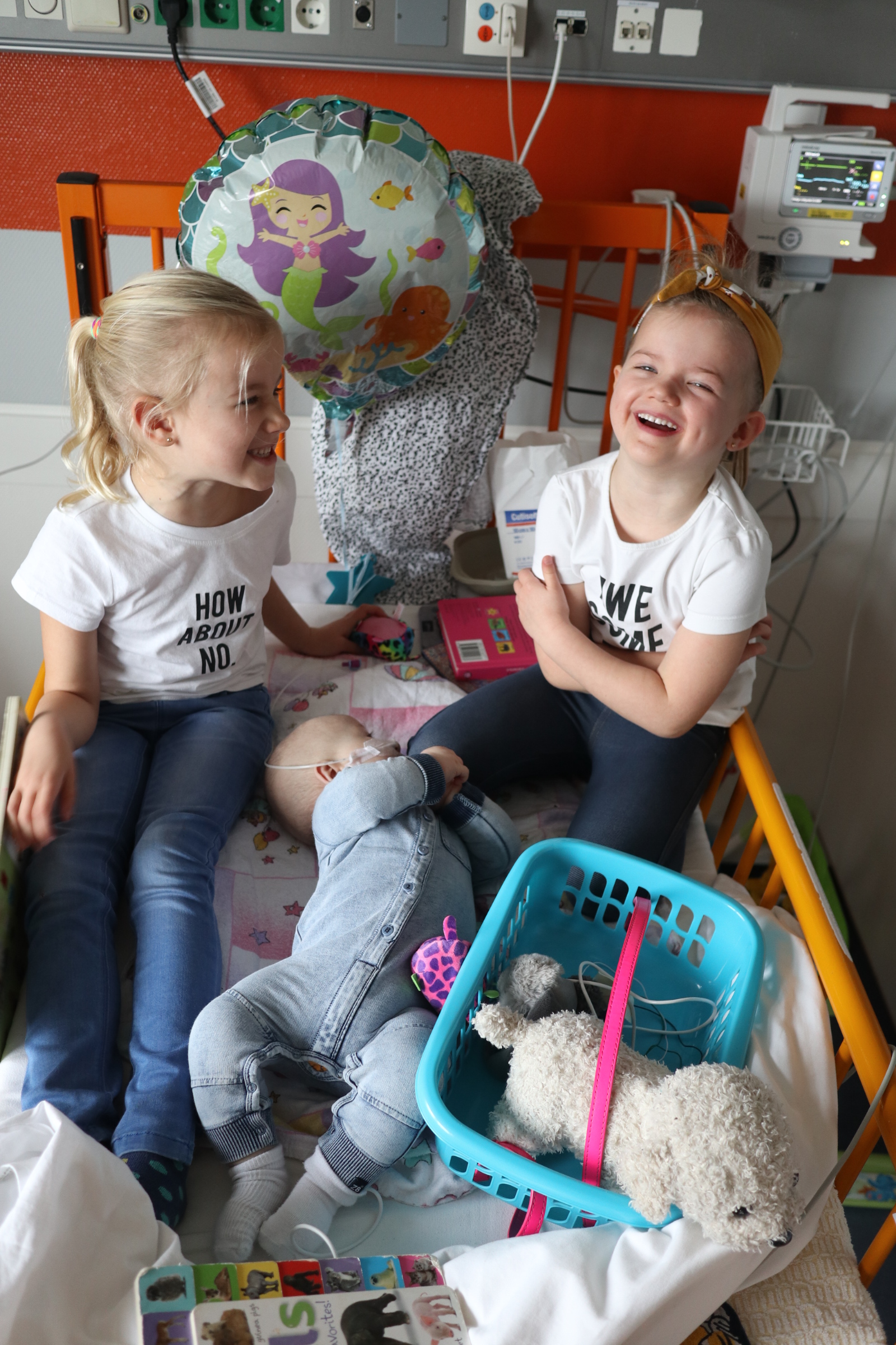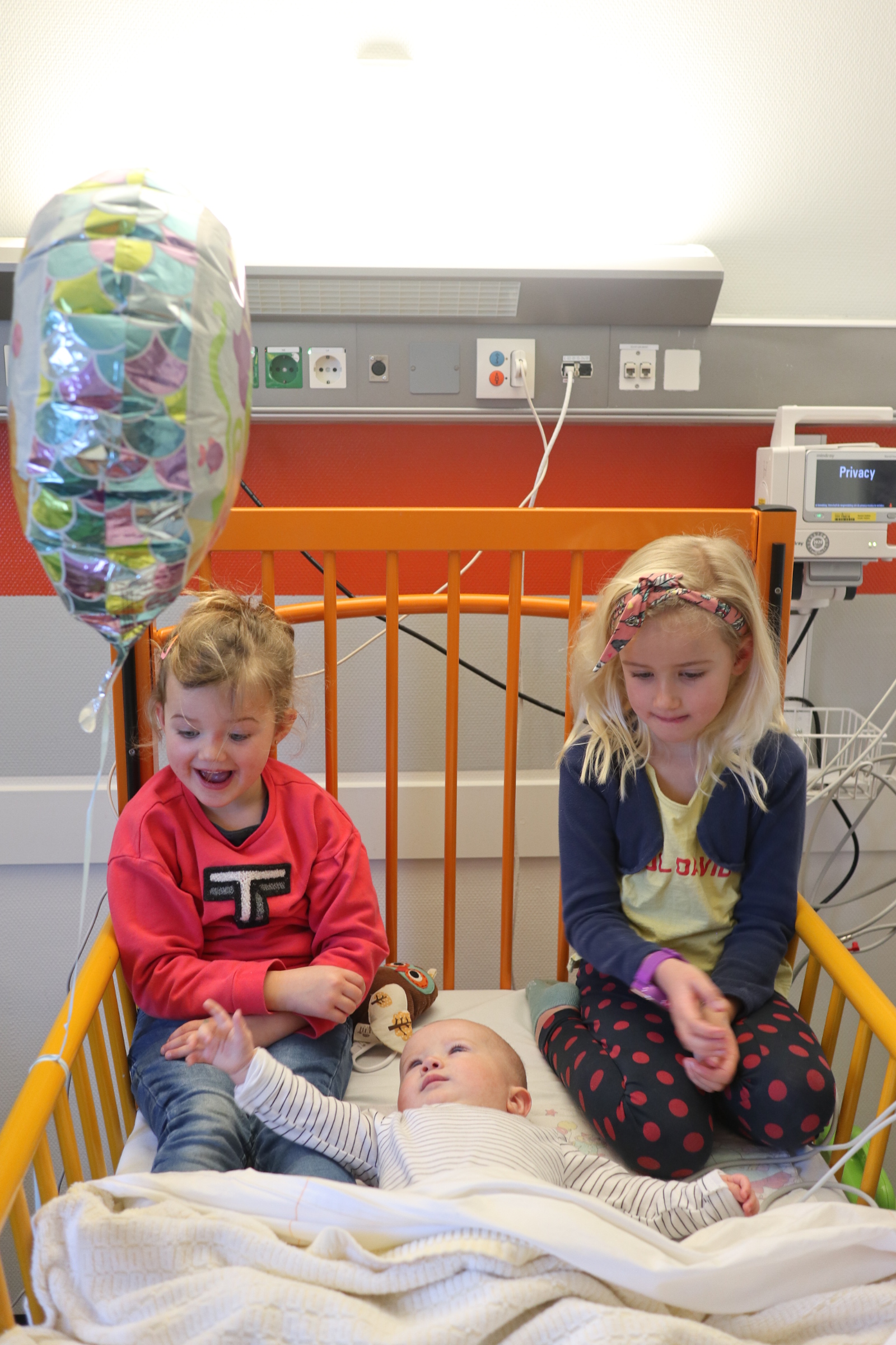 En toen werd ons wereldje letterlijk en figuurlijk heel klein. We leefden op een vierkante meter met ons zieke mannetje. We konden geen kant met hem op ivm alle snoeren en na 2 dagen waren daar ook een sonde en een zuurstofslangetje aan toegevoegd. Alles om hem te helpen om aan te sterken en het virus te bestrijden. Wat ook goed hielp waren de bezoekjes van Sol zijn allerliefste zussen. Zodra zij Sol z’n kamertje binnenkwamen, zag je bij Sol wat meer leven in zijn ogen. Hij is ZO verliefd op zijn zussen, dat hij voor hen altijd nog ergens een restje energie heeft om naar hen te lachen. Jools en Pippa kwamen zo goed als dagelijks twee uurtjes op bezoek en vermaakten zich prima met rubber handschoenen, mondkapjes, een white board en een activiteitenboekje die ze van de pedagogisch medisch medewerkster hadden gekregen. De meiden kunnen zo aan de slag als Clini Clowns, want hun voorleesverhaaltjes, hondenshows en liedjes vielen helemaal in de smaak bij de patiënt. Zelfs op z’n allerziekste momenten reageerde hij toch op zijn zussen. Als papa en mama kun je daar alleen maar niet normaal trots op zijn.