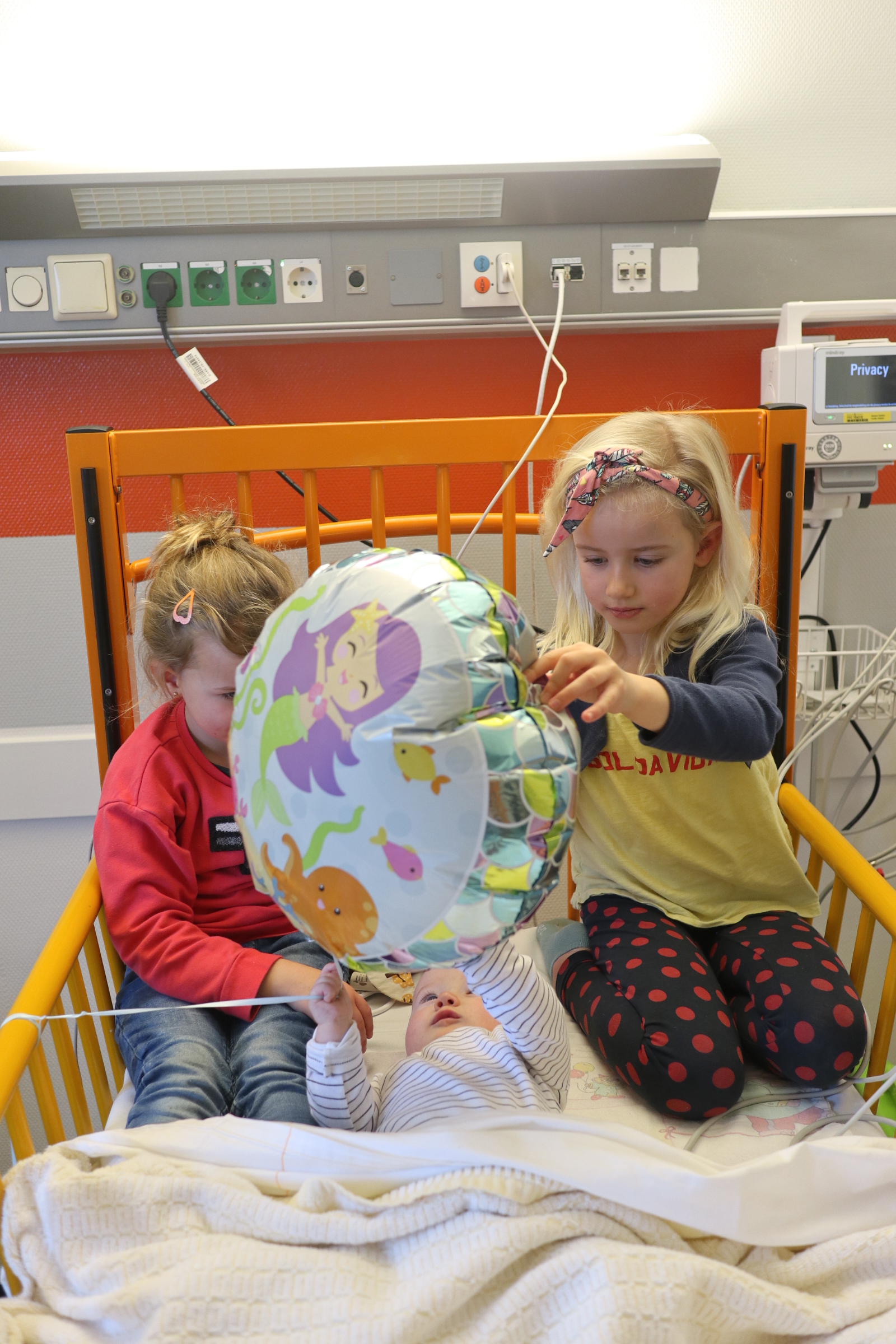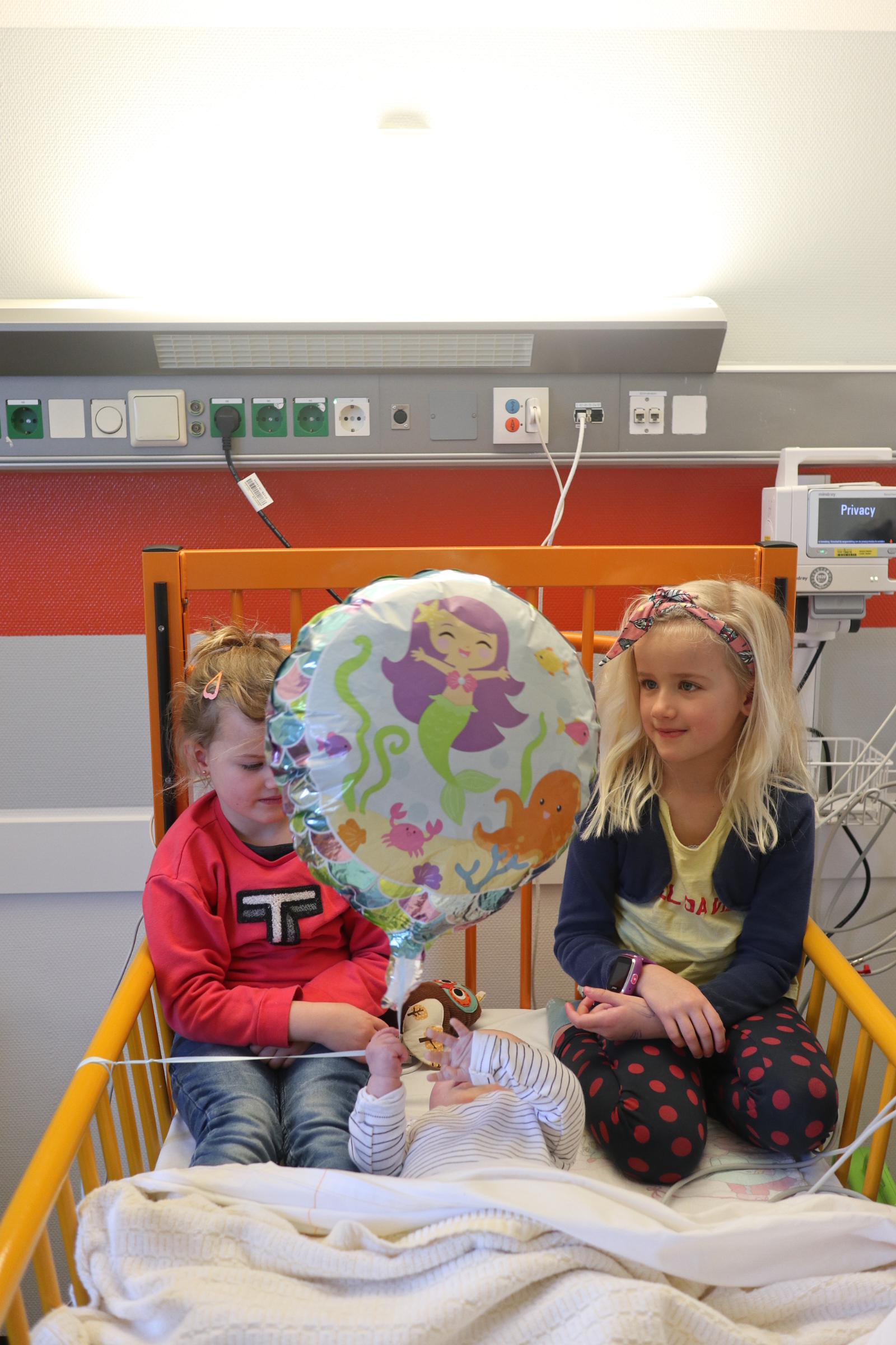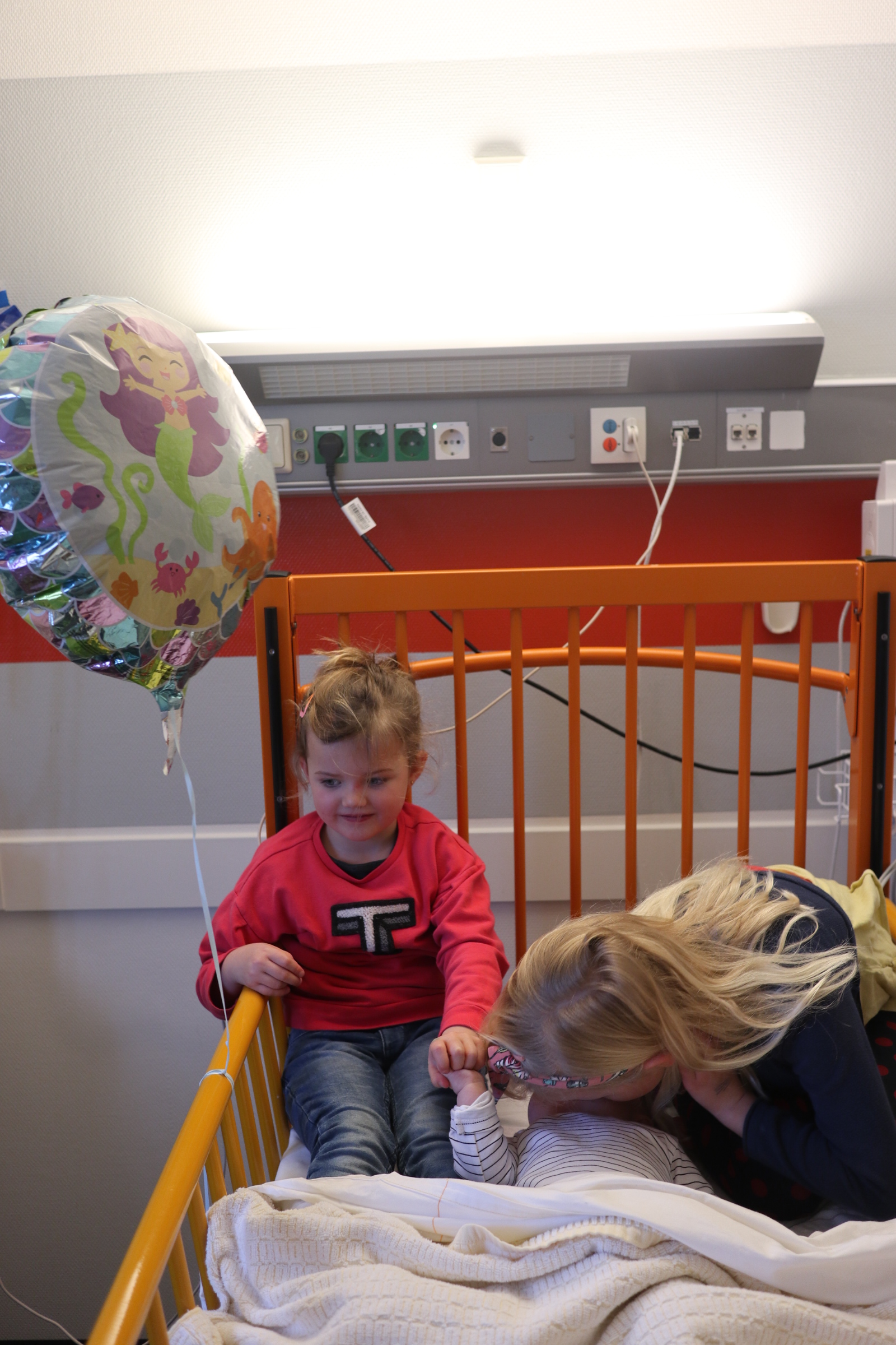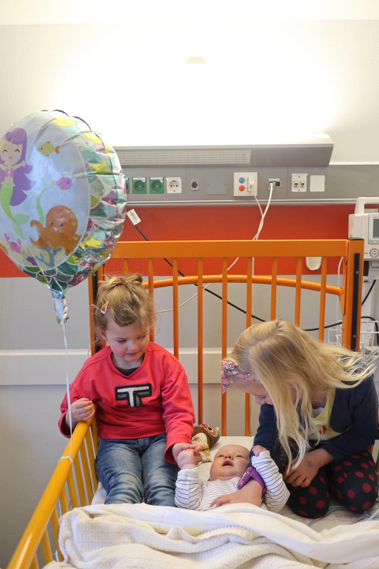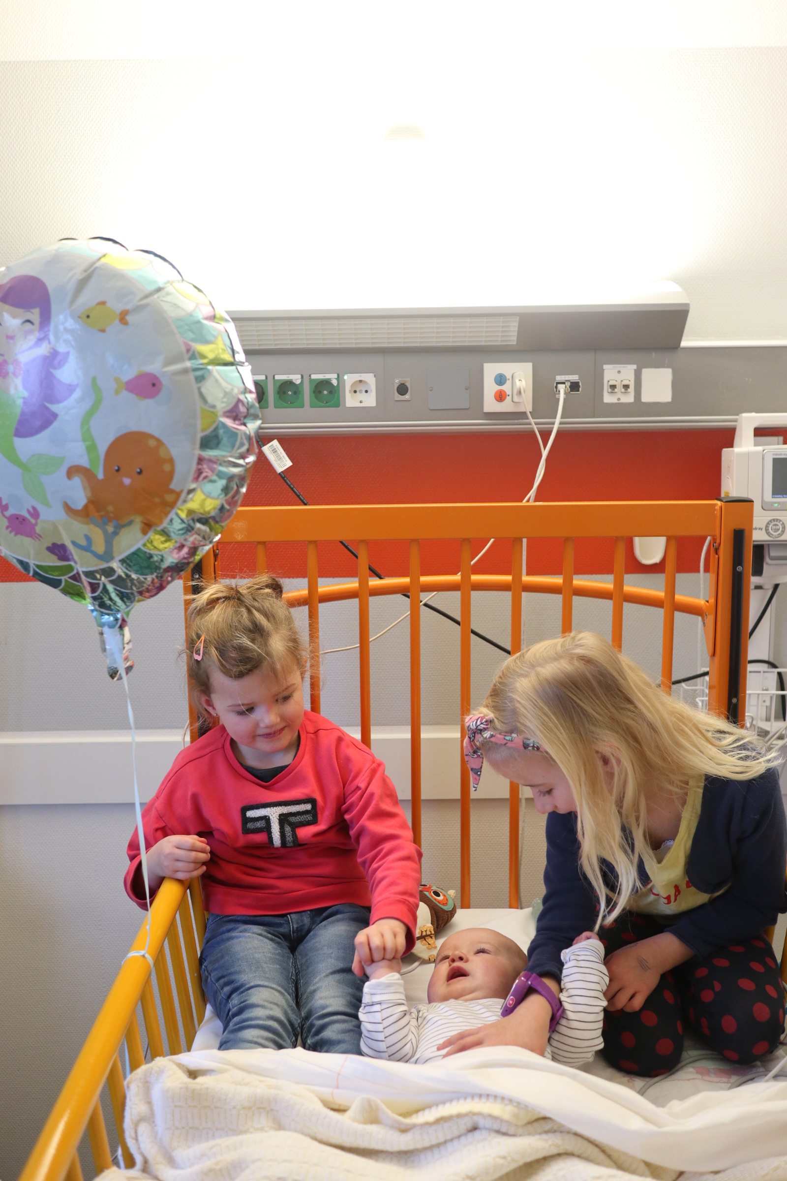 En toen werd ons wereldje letterlijk en figuurlijk heel klein. We leefden op een vierkante meter met ons zieke mannetje. We konden geen kant met hem op ivm alle snoeren en na 2 dagen waren daar ook een sonde en een zuurstofslangetje aan toegevoegd. Alles om hem te helpen om aan te sterken en het virus te bestrijden. Wat ook goed hielp waren de bezoekjes van Sol zijn allerliefste zussen. Zodra zij Sol z’n kamertje binnenkwamen, zag je bij Sol wat meer leven in zijn ogen. Hij is ZO verliefd op zijn zussen, dat hij voor hen altijd nog ergens een restje energie heeft om naar hen te lachen. Jools en Pippa kwamen zo goed als dagelijks twee uurtjes op bezoek en vermaakten zich prima met rubber handschoenen, mondkapjes, een white board en een activiteitenboekje die ze van de pedagogisch medisch medewerkster hadden gekregen. De meiden kunnen zo aan de slag als Clini Clowns, want hun voorleesverhaaltjes, hondenshows en liedjes vielen helemaal in de smaak bij de patiënt. Zelfs op z’n allerziekste momenten reageerde hij toch op zijn zussen. Als papa en mama kun je daar alleen maar niet normaal trots op zijn.
