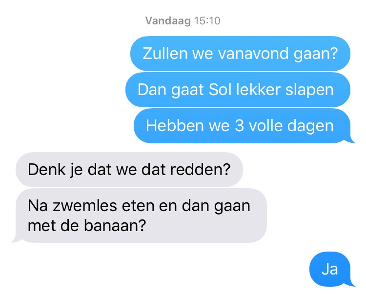 Aan een georganiseerde vakantievoorbereiding of inpakstress doen we nooit. De avond of ochtend van tevoren rapen we wat spullen bij elkaar en zijn we klaar om te gaan. We hadden dus ook nog niets geregeld voor morgen. Dat zouden we nog wel doen als de kids op bed lagen ofzo. Maar toen ik vanmiddag met de kids naar Pippa’s zwemles reed, bedacht ik ineens hoe chill het zou zijn als we morgenochtend lekker wakker konden worden in Duitsland. En ‘s avonds reizen leek me eigenlijk ook wel fijner voor Sol. Die gaat overdag niet 4 uur slapen Ik stuurde Thaddeus (die nog aan het werk was) een berichtje met deze hersenspinsel en kreeg dit een paar minuten later terug: