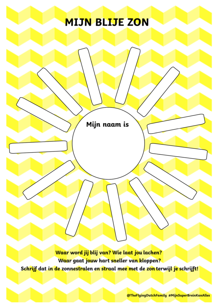 Print het Denk- en Doeblad uit voor alle gezinsleden. Laat iedereen in de zonnestralen schrijven waar hij of zij blij van wordt. Het is zo waardevol om deze oefening allemaal te doen en van elkaar te leren waar een ieder blij van wordt. Maak hier tijd voor vrij. Je zult voelen hoe het je tijd waard is. Het is zo belangrijk om je brein iedere dag te vullen met blije gedachten, om activiteiten te ondernemen waar je van geniet en om mensen om je heen te hebben die jou positieve energie geven. Samen heel bewust met dit onderwerp aan de slag gaan kan je gezin zo’n heerlijke boost geven! Een prachtig begin van het heel bewust trainen van een Growth Mindset.