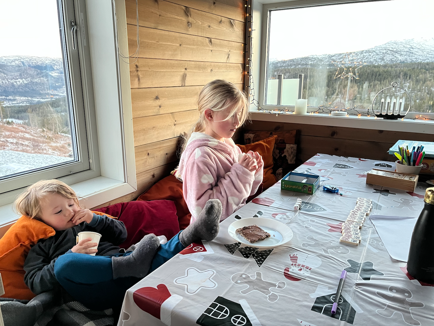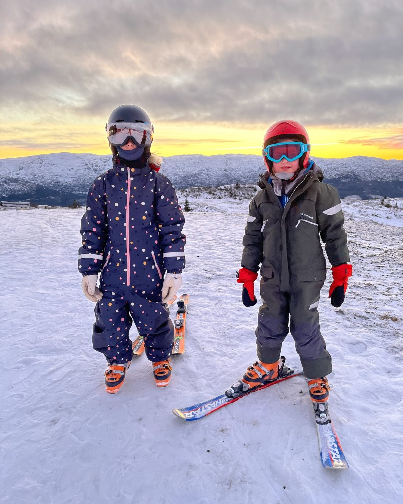 We pakken het liefst zo min mogelijk spullen in als we reizen. Dat hebben we geleerd toen we 14 maanden op reis waren: less = chiller en overzichtelijker. Maar wat als je naar de sneeuw gaat ipv naar de zon? Dan heb je toch al gauw heel wat meer spullen nodig. Handschoenen, mutsen, sjaals, sneeuwpakken, thermokleding, laarzen, helmen, skischoenen, ski’s, snowboardschoenen, snowboard, sleetjes en de allerlei basic daily needs natuurlijk. Daar was ik op donderdag (de dag voor vertrek op vrijdag 24 december) langzaamaan mee begonnen om klaar te leggen. Totdat we het voorstel kregen van de eigenaars van de Tiny Cabin die we gehuurd hadden om een dagje eerder te komen, omdat het huisje al vrij was. ‘Langzaamaan klaarleggen’ veranderde in Speed Tetris voor gevorderden en 1,5 uur later zaten we met z’n vijfjes in de auto op weg van ons huis in Aksdal naar Voss.