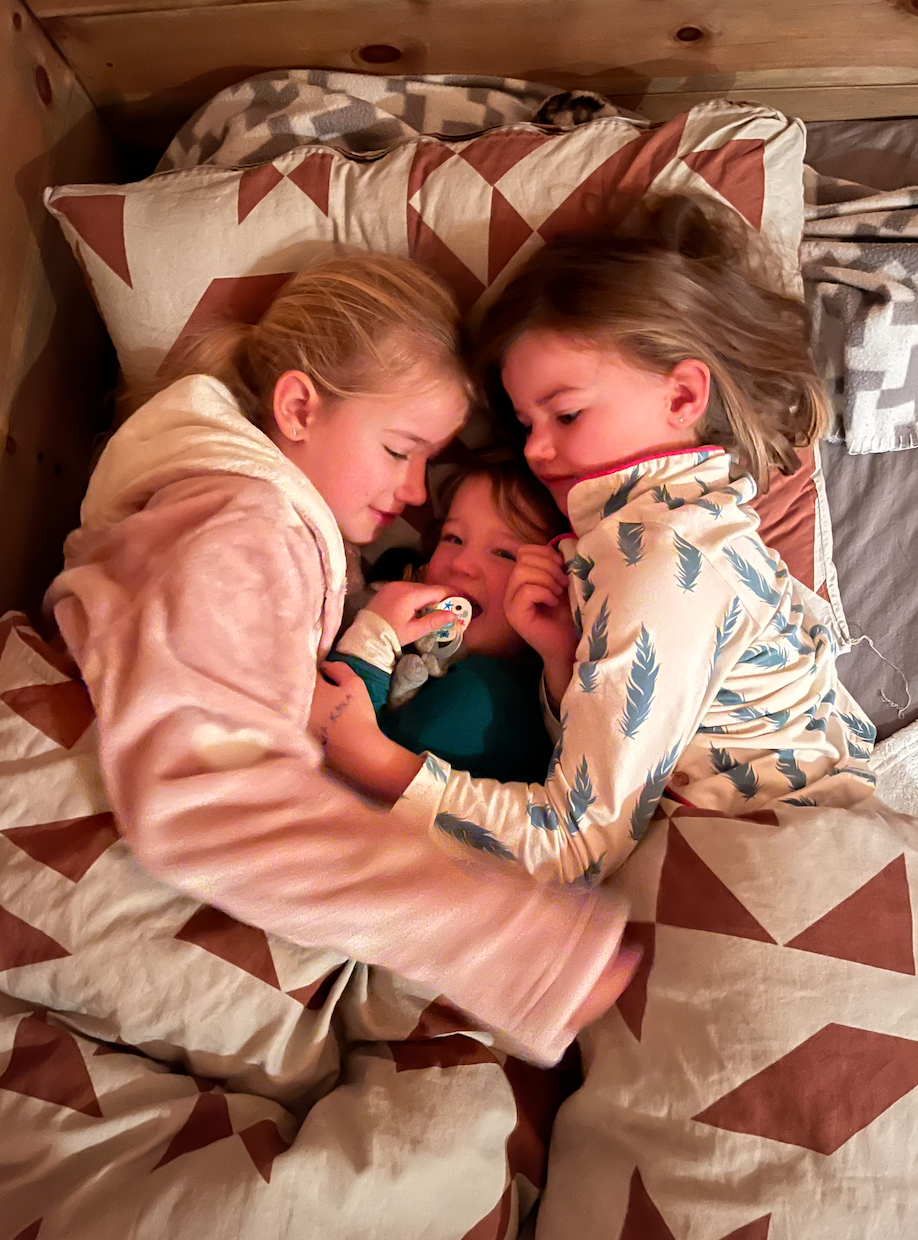 Zo’n hele dag op ski’s is hard werken voor ieder gezinslid. Voor Sol (nog geen 2,5 jaar oud en nog geen meter lang), voor Pippa & Jools (3 uur opperste concentratie tijdens de skiles met z’n tweetjes en 1 leraar), maar ook voor papa en mama is het topsport. Een spartelende peuter aan- en uit- en aan- en uitkleden is geen walk in the park. Een peuter met een spanningsboog van 3 seconden geconcentreerd een berg af laten skiën is een high intensity workout. Ook de après-ski is ietsjes anders dan voorheen. Als iedereen moe is, bevordert dat niet persé de sfeer. Aan dat rozige, vermoeide gevoel moesten we allemaal even wennen de eerste twee dagen. Toen we de lat (jaja, woordgrapje) wat lager legden de dagen erna -door onszelf niet zoveel met elkaar te bemoeien en elkaar wat down-time te gunnen- ging het een stuk beter. Onze lijven en hoofden hadden allemaal megaprestaties geleverd. Daar mag je best even de tijd voor nemen om van bij te komen op een manier die jij zelf fijn vindt.